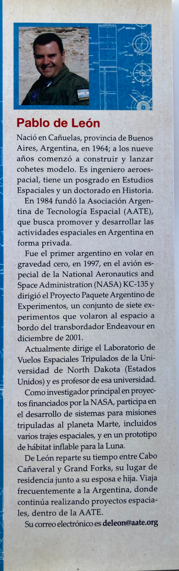 Su autor, ingeniero y director del Laboratorio de Vuelos Espaciales Tripulados de la Universidad de Dakota del Norte, Estados Unidos de América, no sólo es especialista en el diseño y construcción de trajes espaciales sino, además, un ferviente entusiasta e historiador de lo desarrollado en nuestro país en cuanto a materia aeroespacial se refiere.