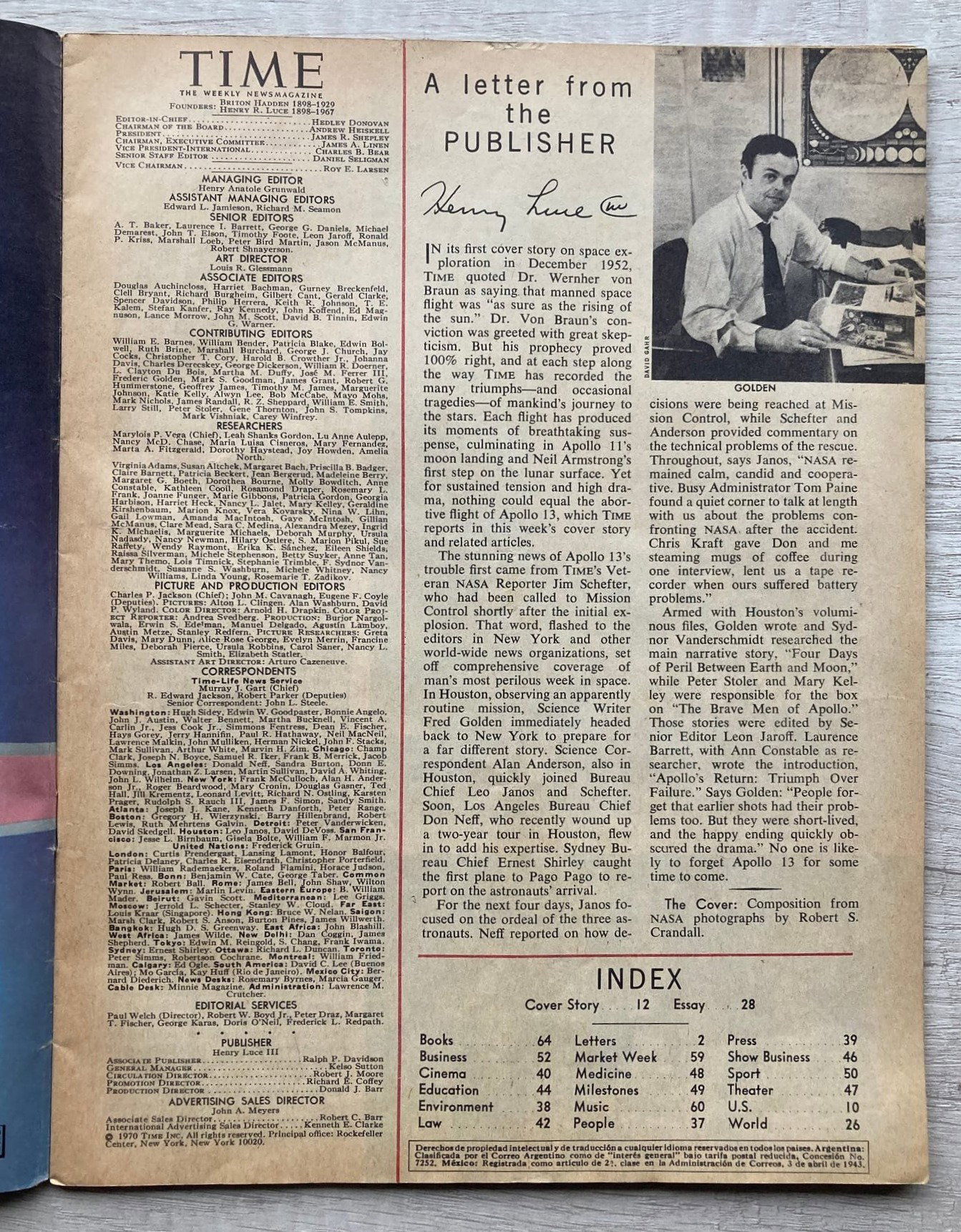 Edición de la revista TIME correspondiente al 27 de abril de 1970. El artículo principal de dicha edición correspondió a la famosa misión Apollo 13.