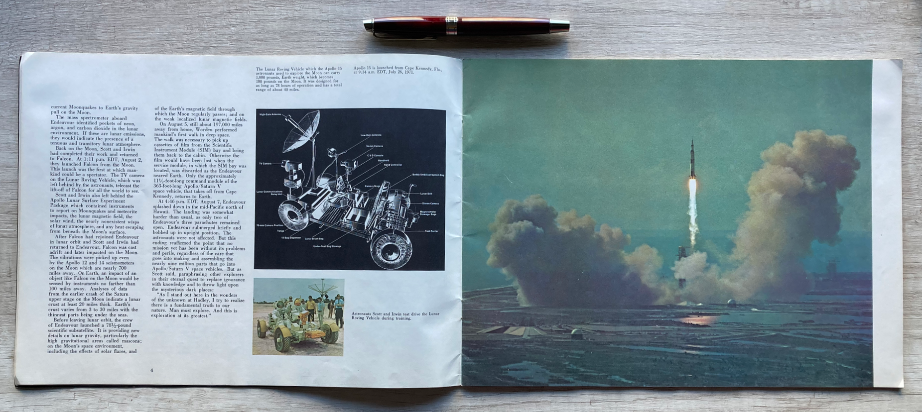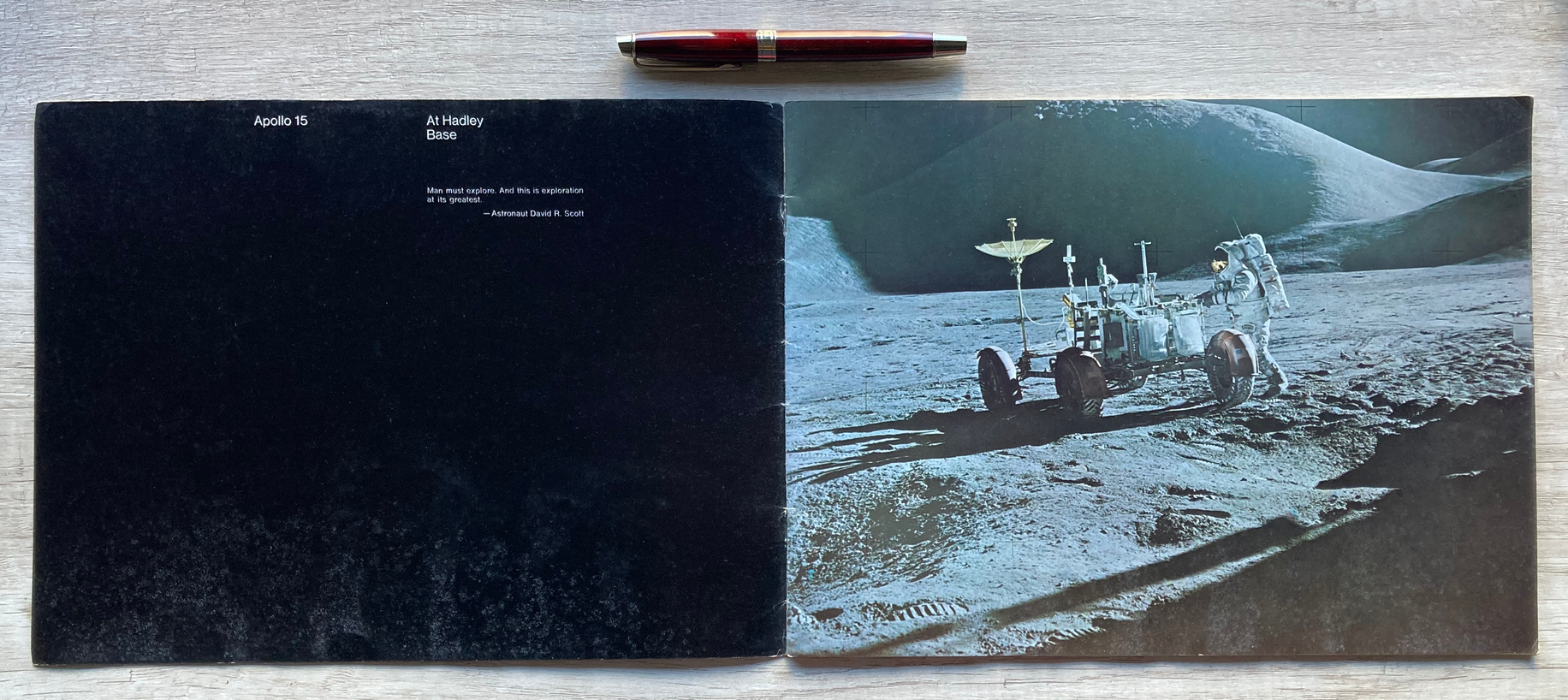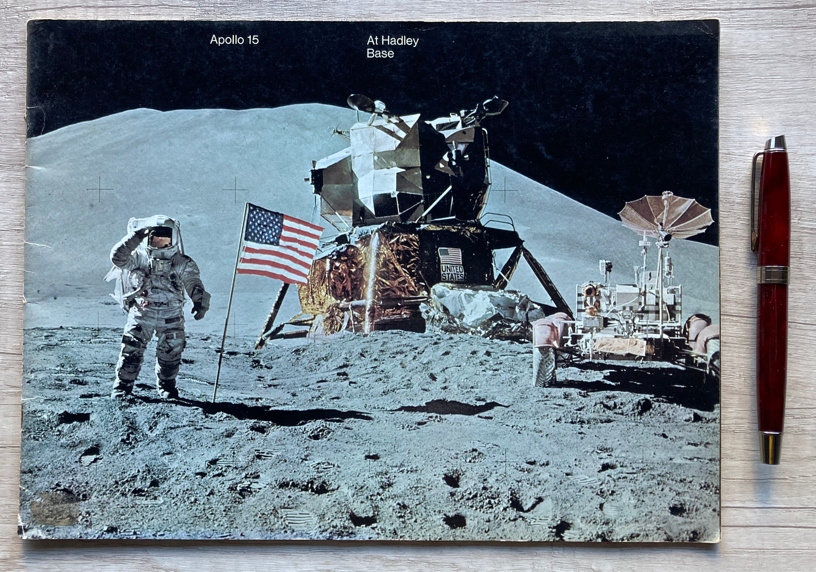 En la Base Hadley, una publicación a todo color de la Oficina de Asuntos Públicos de la NASA en donde se describe la misión Apollo 15. Impresa en papel ilustración, consta de 34 páginas.