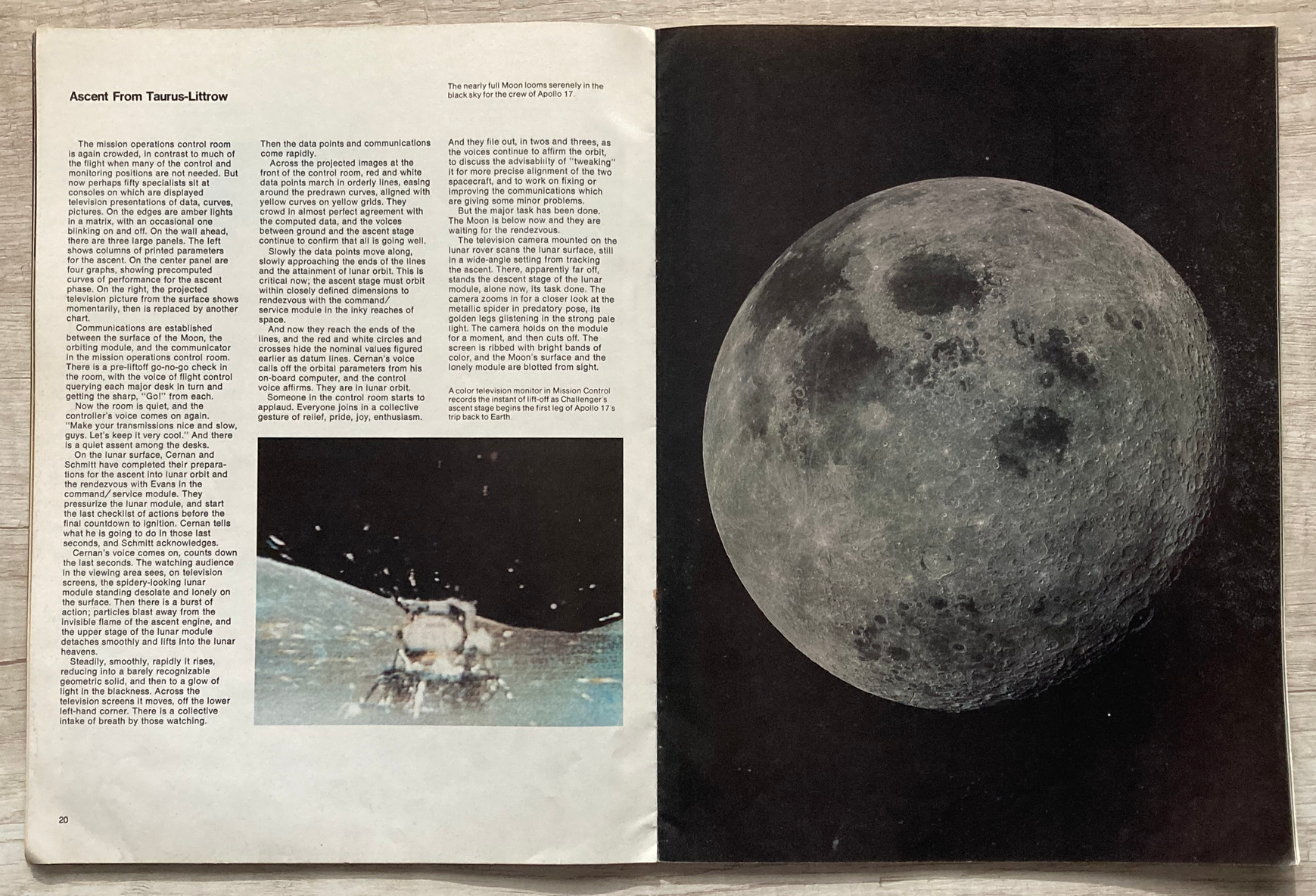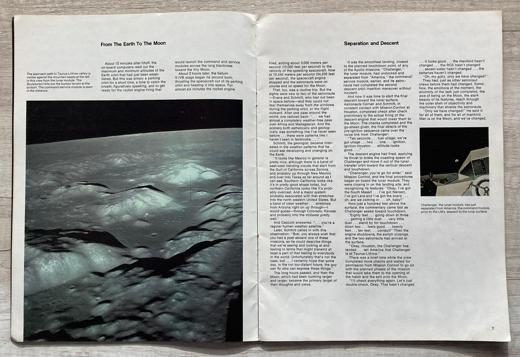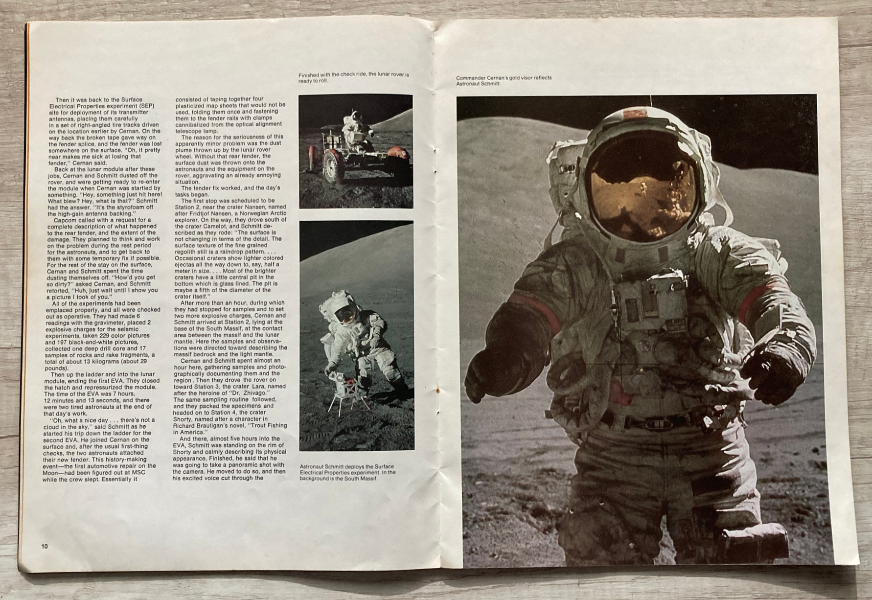 A lo largo de 34 páginas en papel calidad fotográfica y a todo color, esta publicación recorre las principales características de lo que fue Apollo 17, la última misión tripulada a la Luna.