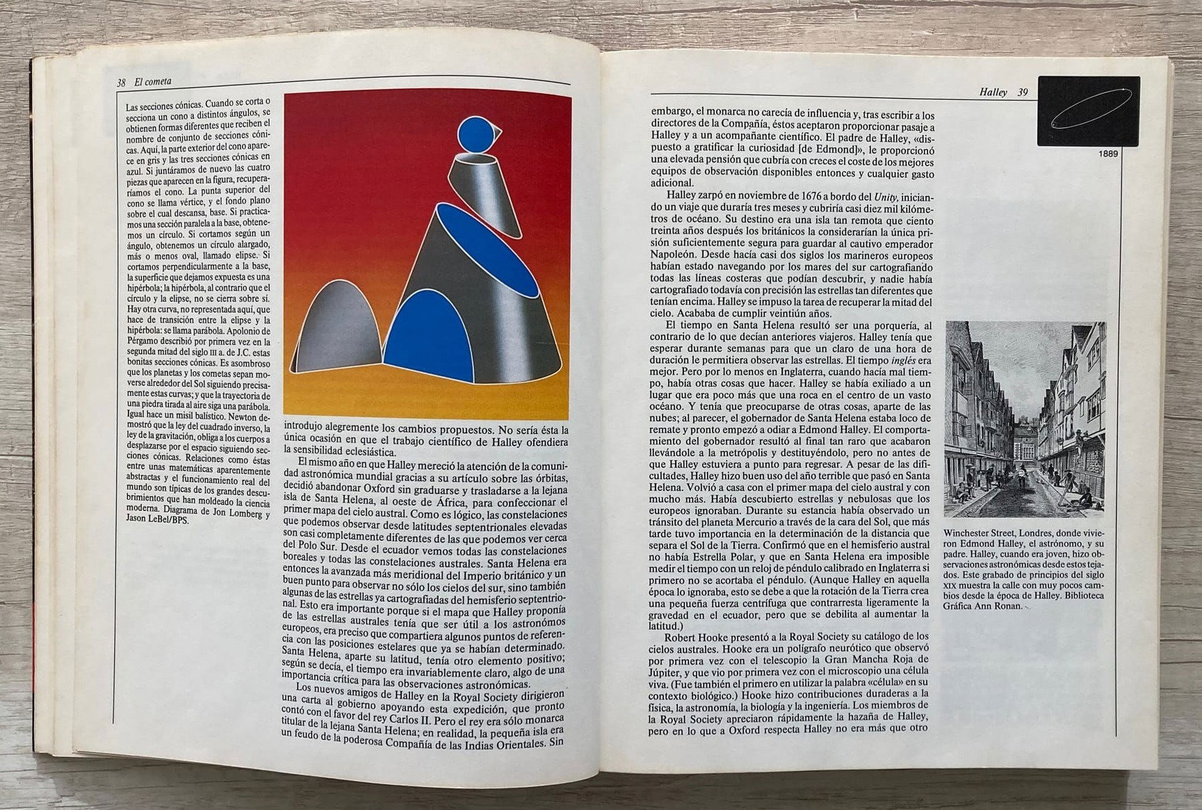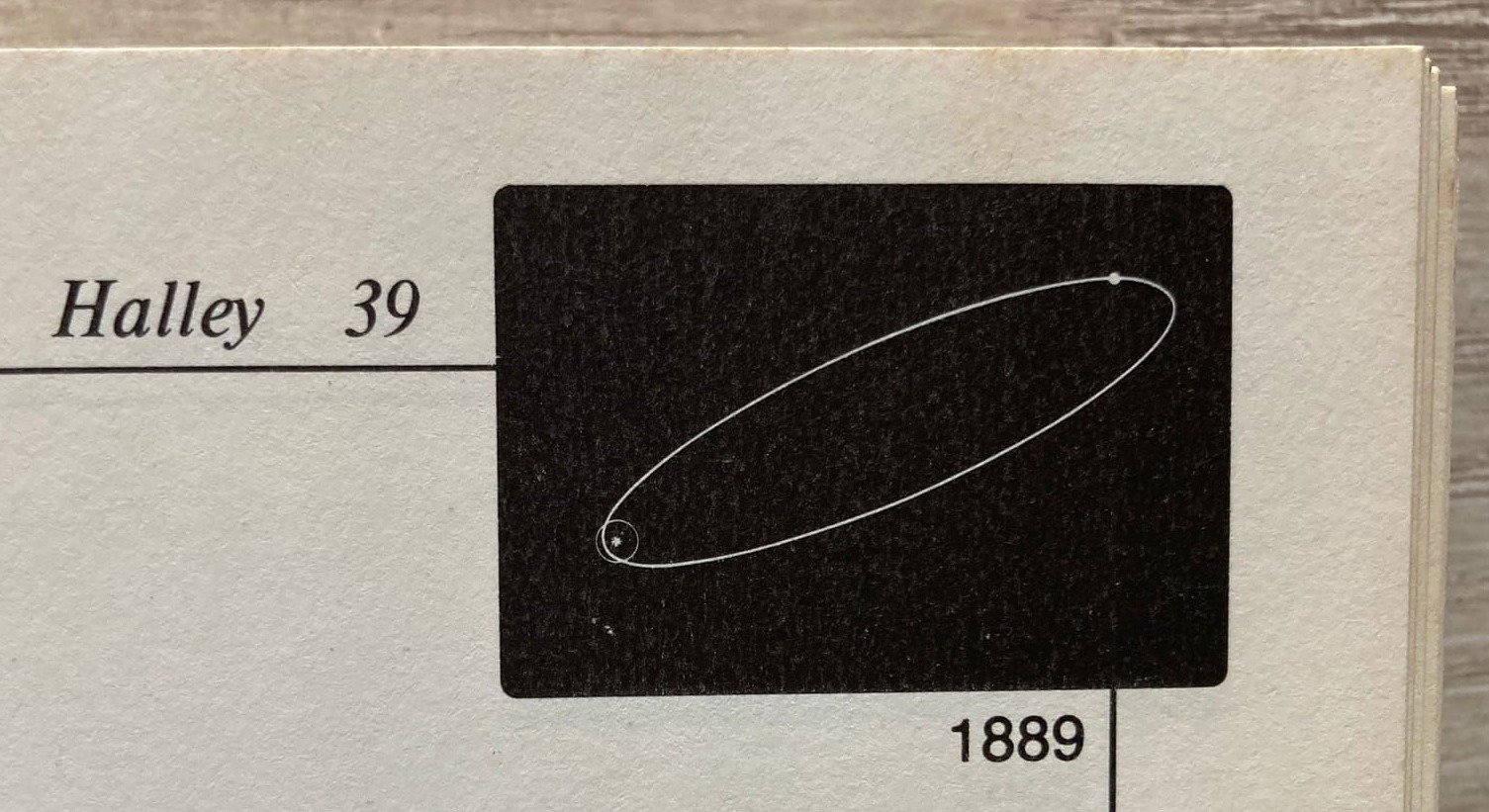 En el extremo superior de cada página impar se encuentra la posición del cometa Halley en diversos años de manera tal de visualizar su movimiento alrededor del Sol al pasar rápidamente las hojas del libro una tras otra.