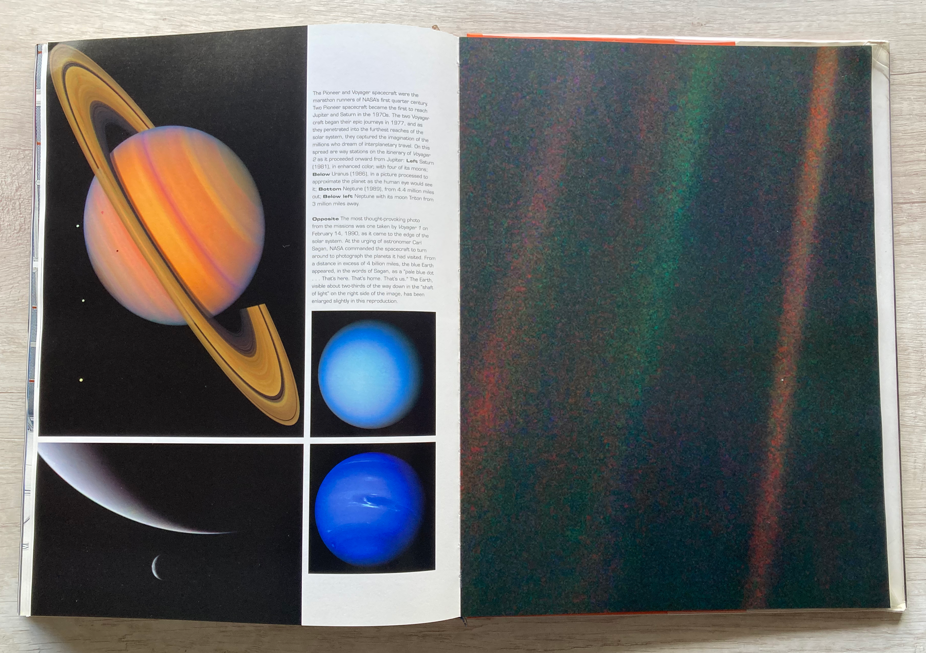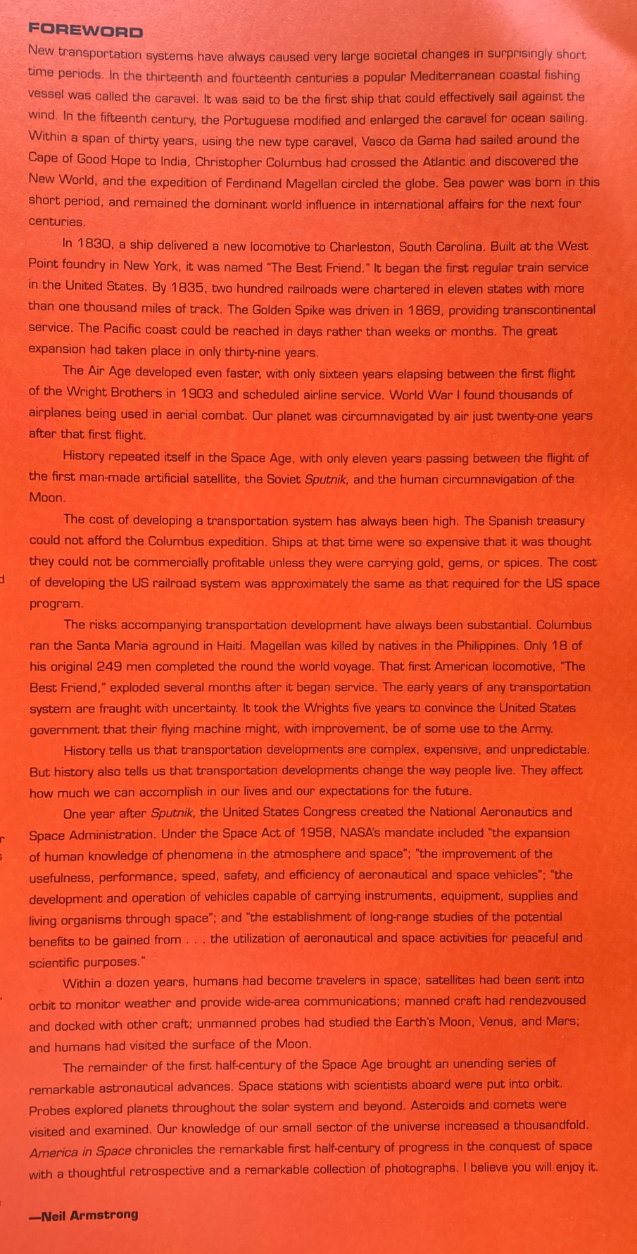 Un libro extraordinario, no sólo por su calidad sino, además, por su tamaño y volumen (37 x 28 cm). Más de 350 páginas en calidad papel ilustración, profusamente ilustrado con lo que han sido los principales hitos de la actividad espacial de los Estados Unidos de América.
