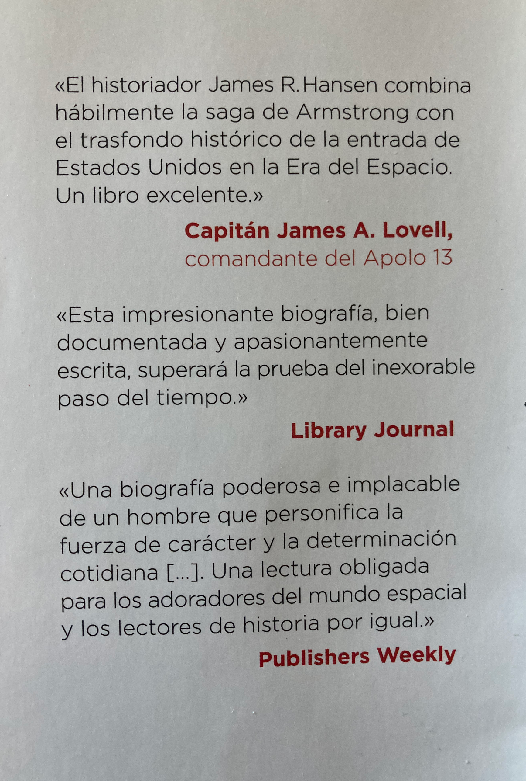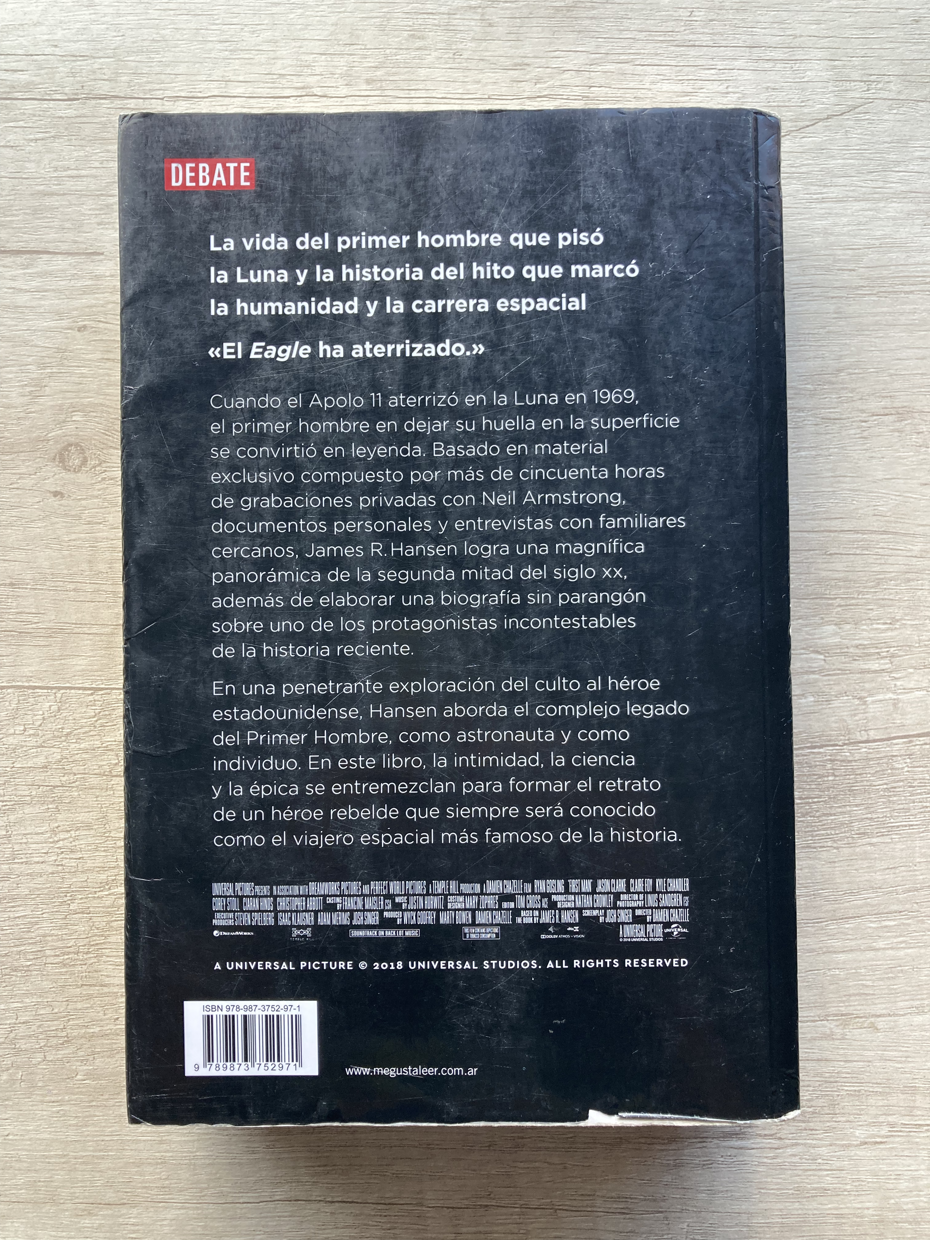 El libro que dio origen al film homónimo. James R. Hansen, autor de diversos libros sobre el sector aeroespacial, fue una de las muy pocas personas que tuvieron acceso en reiteradas oportunidades a conversaciones con Neil Armstrong a fin de plasmar su biografía. Un hermoso libro a partir del cual se recorre en detalle la vida de un ícono de la humanidad: ni más ni menos que la del primer hombre que caminó en la Luna.