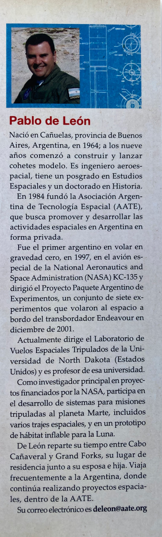 Su autor, ingeniero y director del Laboratorio de Vuelos Espaciales Tripulados de la Universidad de Dakota del Norte, Estados Unidos de América, no sólo es especialista en el diseño y construcción de trajes espaciales sino, además, un ferviente entusiasta e historiador de lo desarrollado en nuestro país en cuanto a materia aeroespacial se refiere.