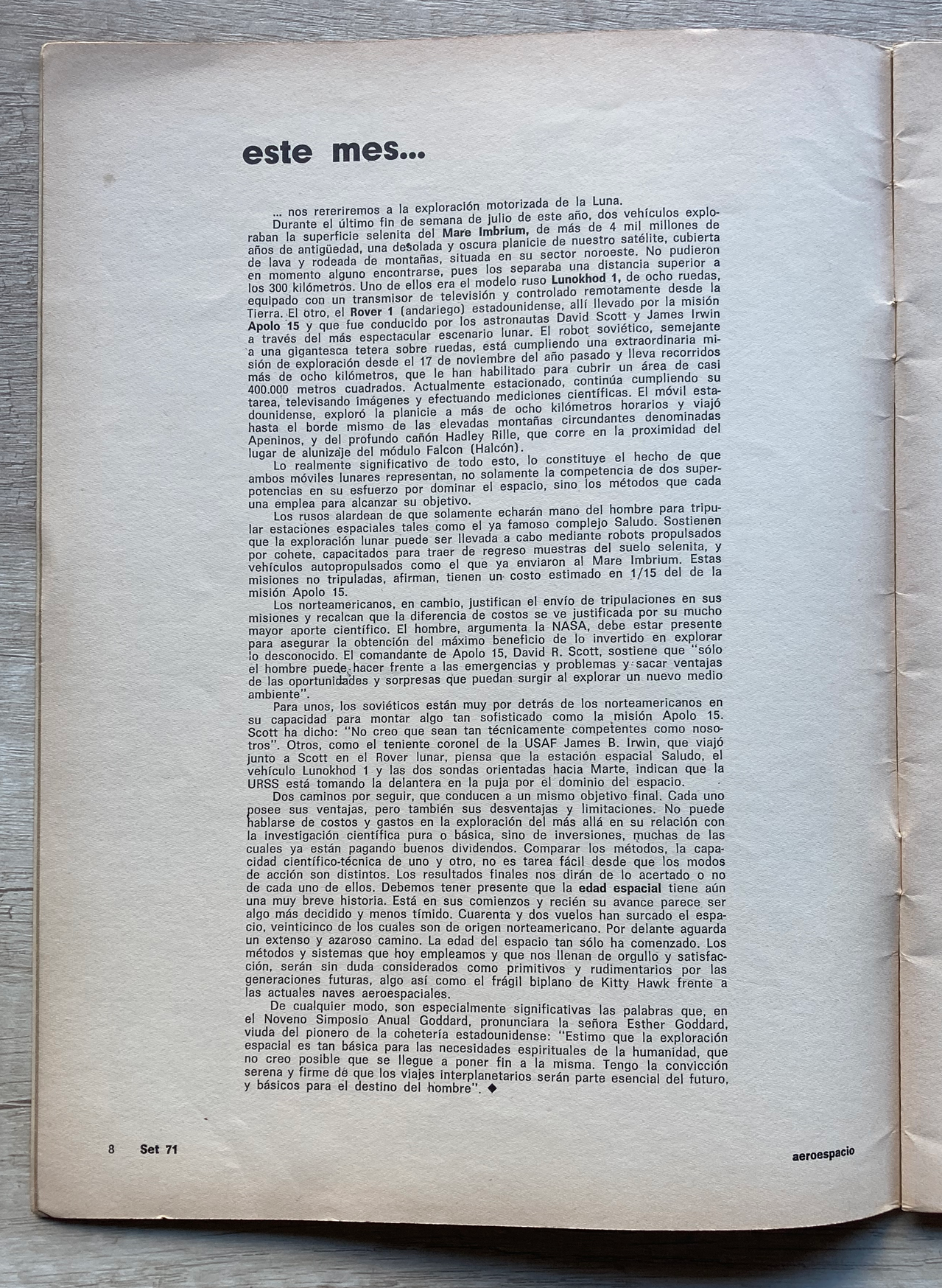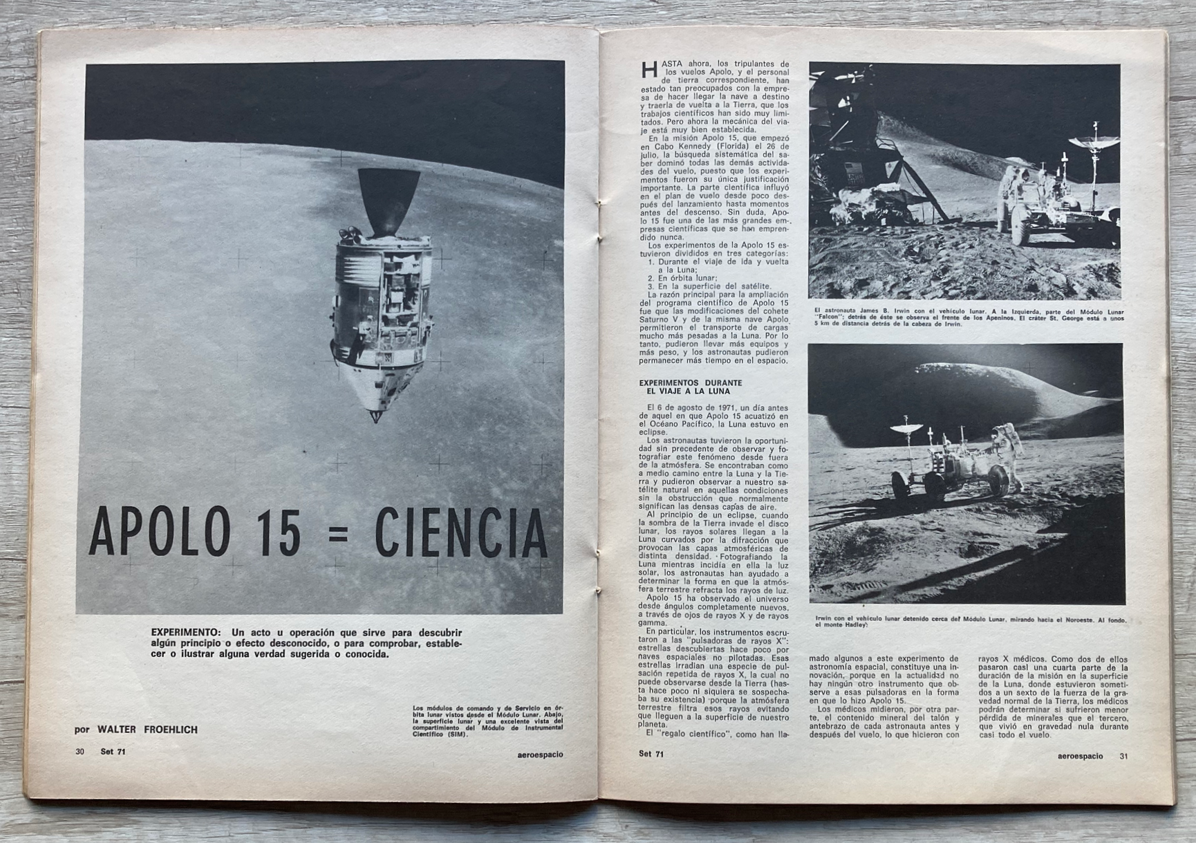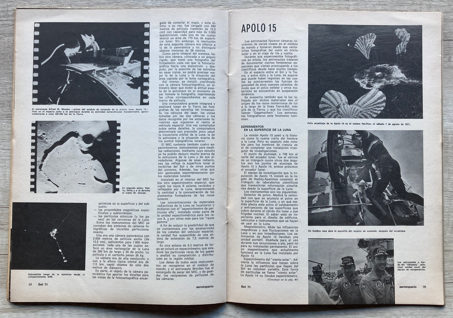 En su edición nro. 349 correspondiente a septiembre de 1971, la reconocida revista argentina Aeroespacio dedicaba su artículo principal a la misión Apollo 15.