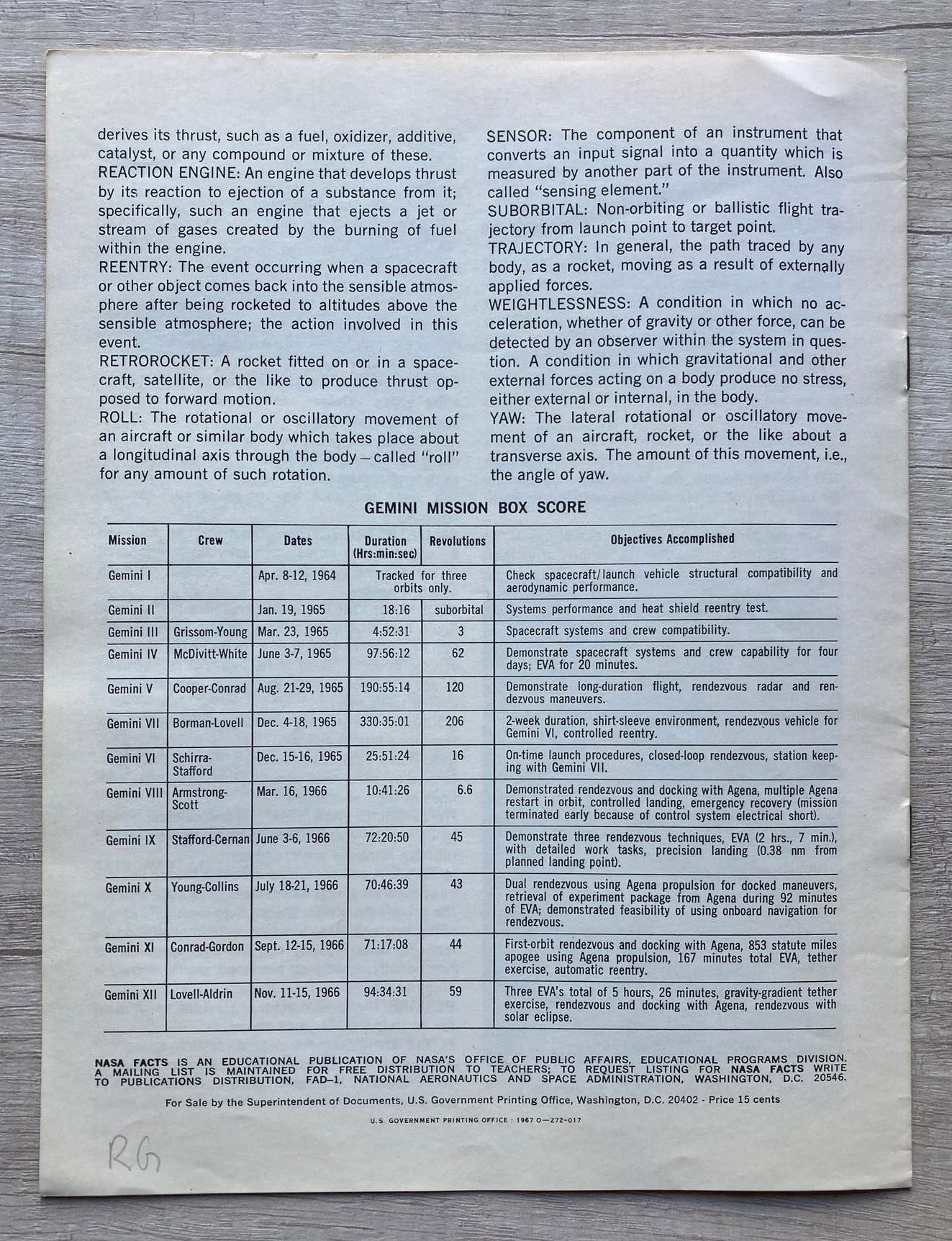 La edición nro.8/volumen II (1967), la famosa publicación "NASA FACTS" estaba dedicada al vuelo espacial tripulado, refiriéndose específicamente a las principales características de los programas espaciales Mercury y Gemini.