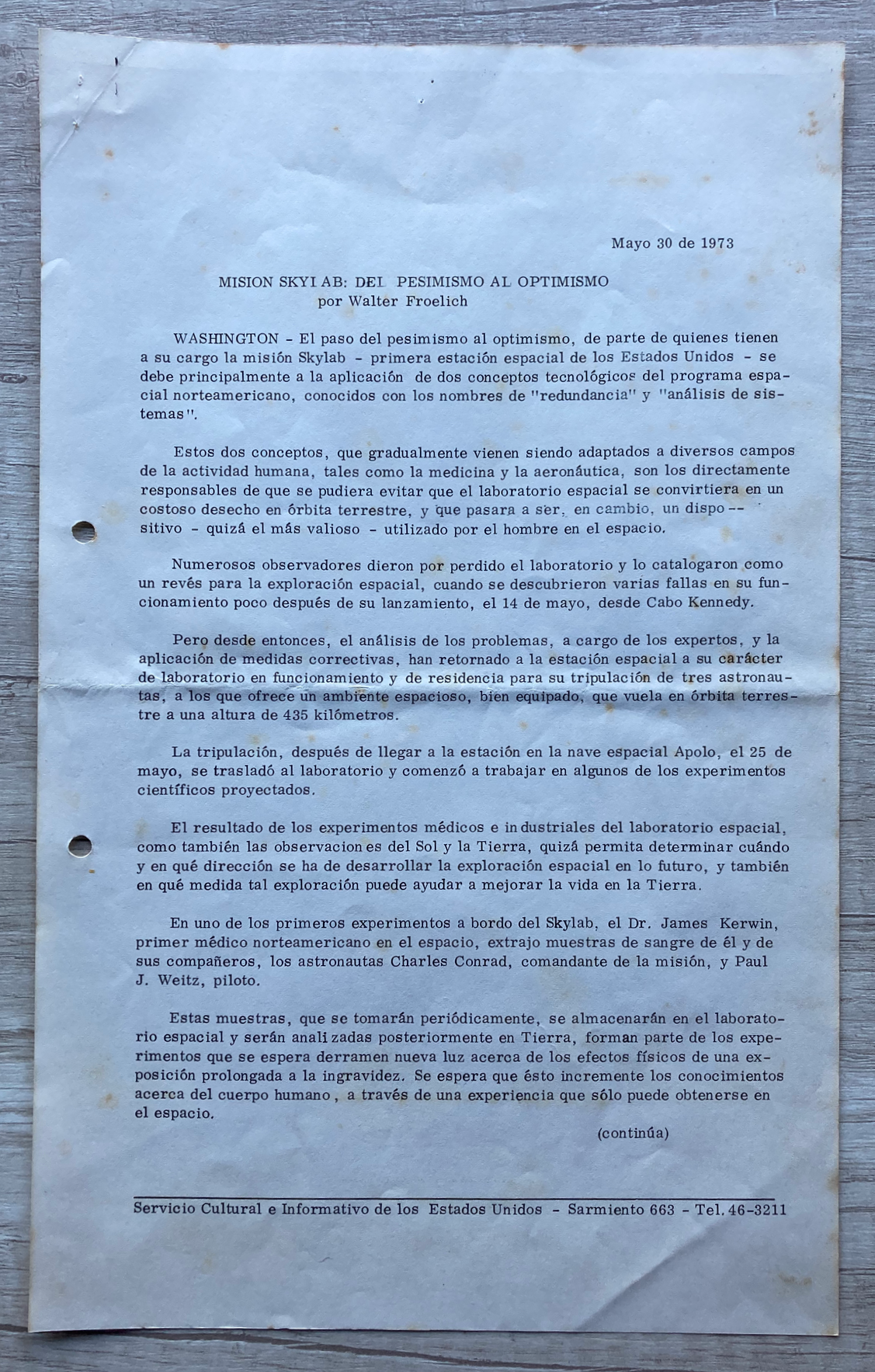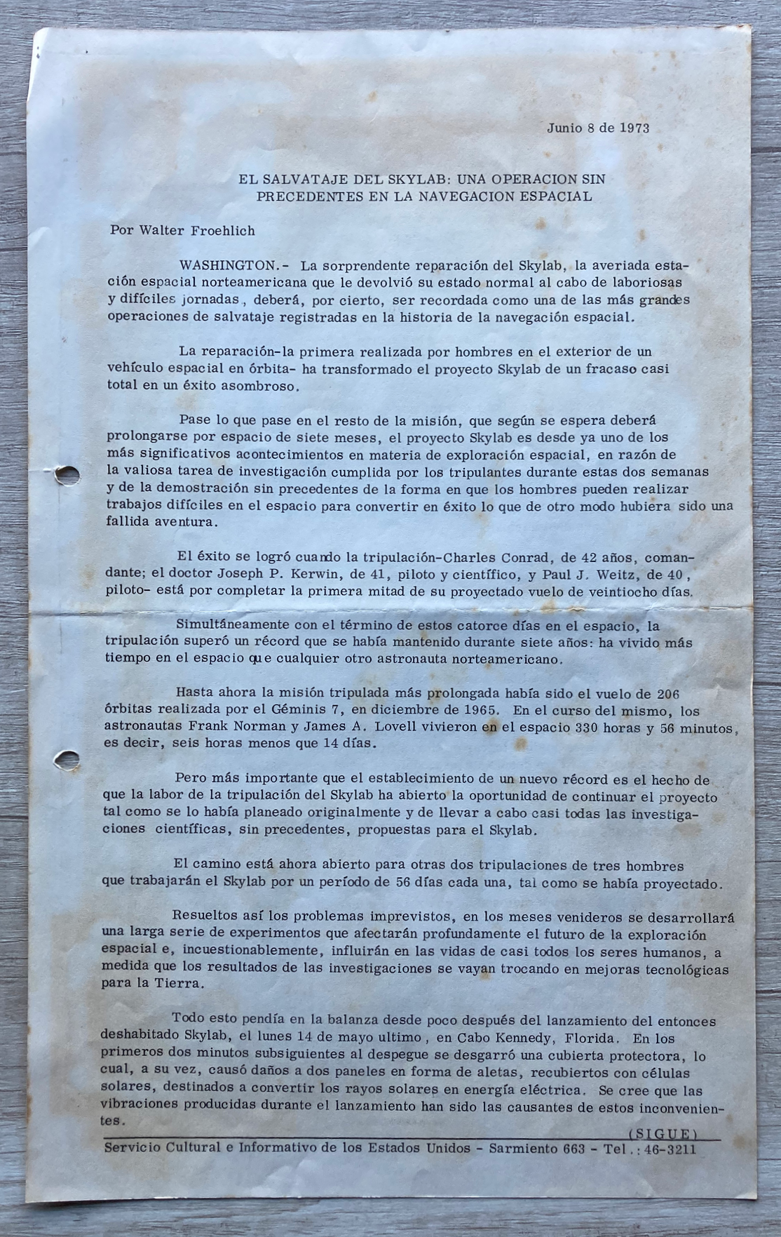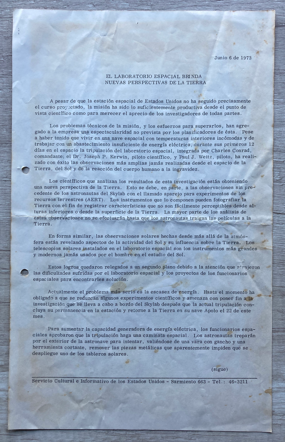 Informes de la NASA sobre las misiones a la estación espacial Skylab, proporcionados por el Servicio Cultural de la Embajada de los Estados Unidos de América en Argentina.