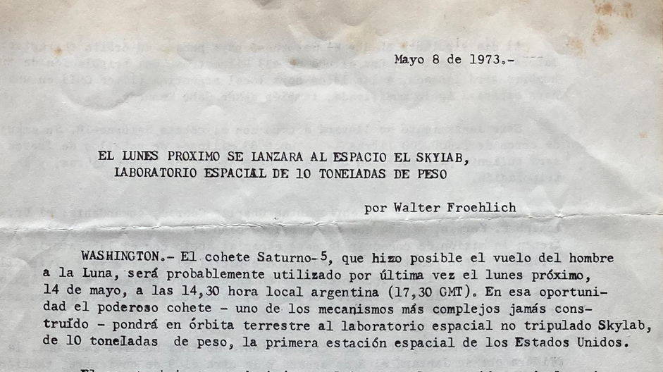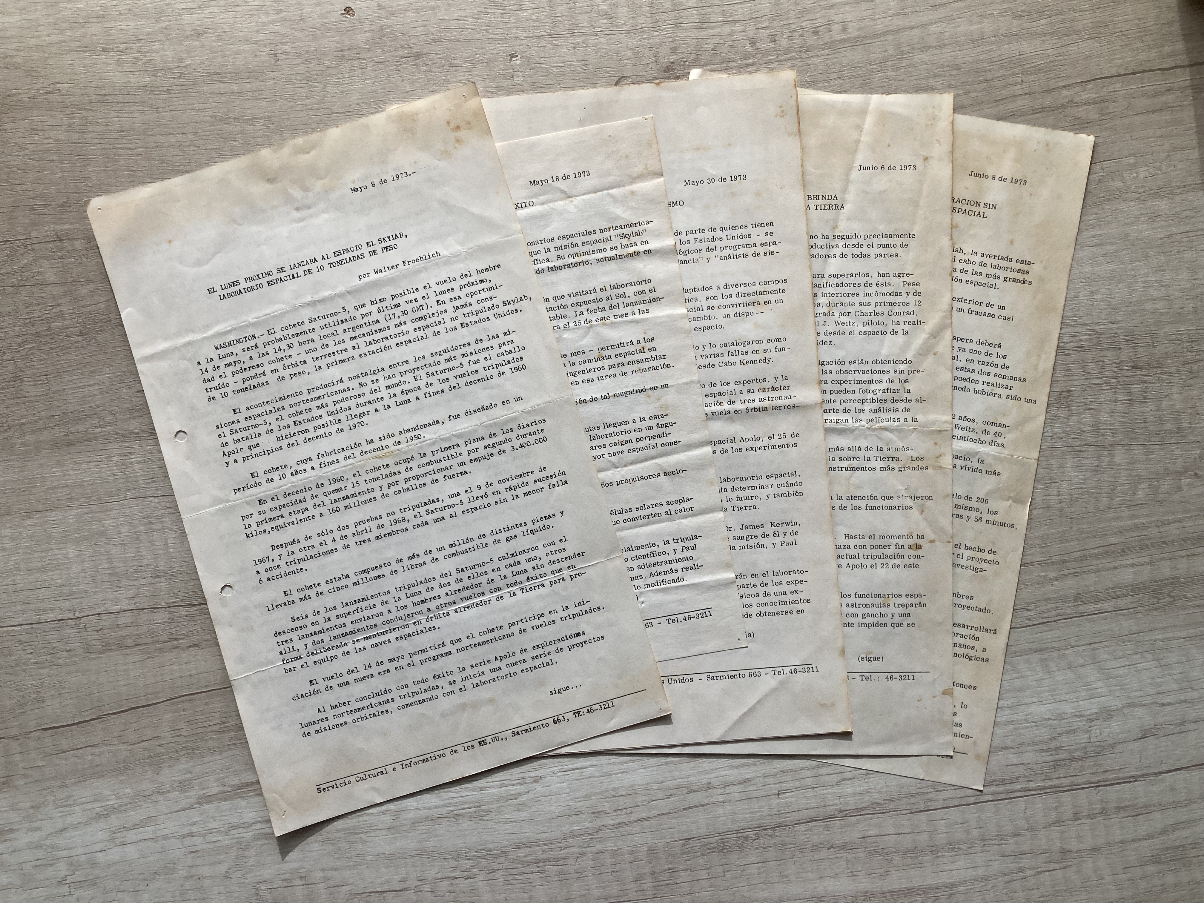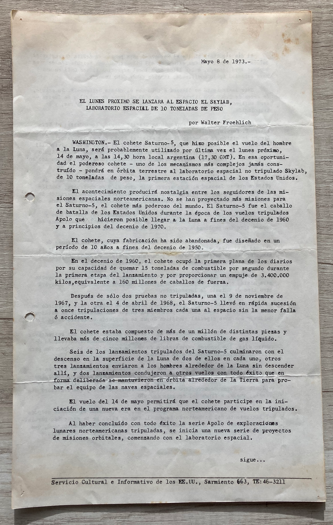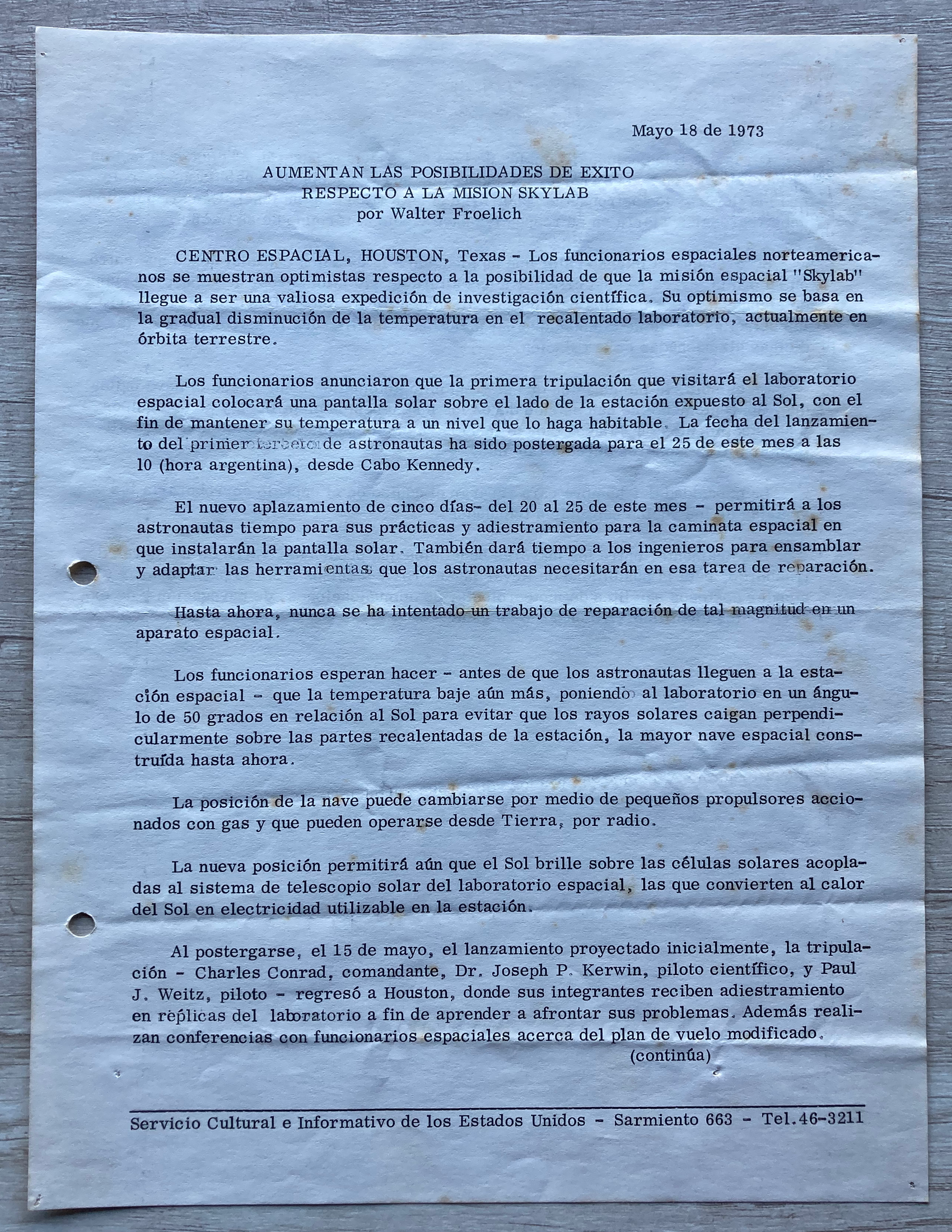 Informes de la NASA sobre las misiones a la estación espacial Skylab, proporcionados por el Servicio Cultural de la Embajada de los Estados Unidos de América en Argentina.