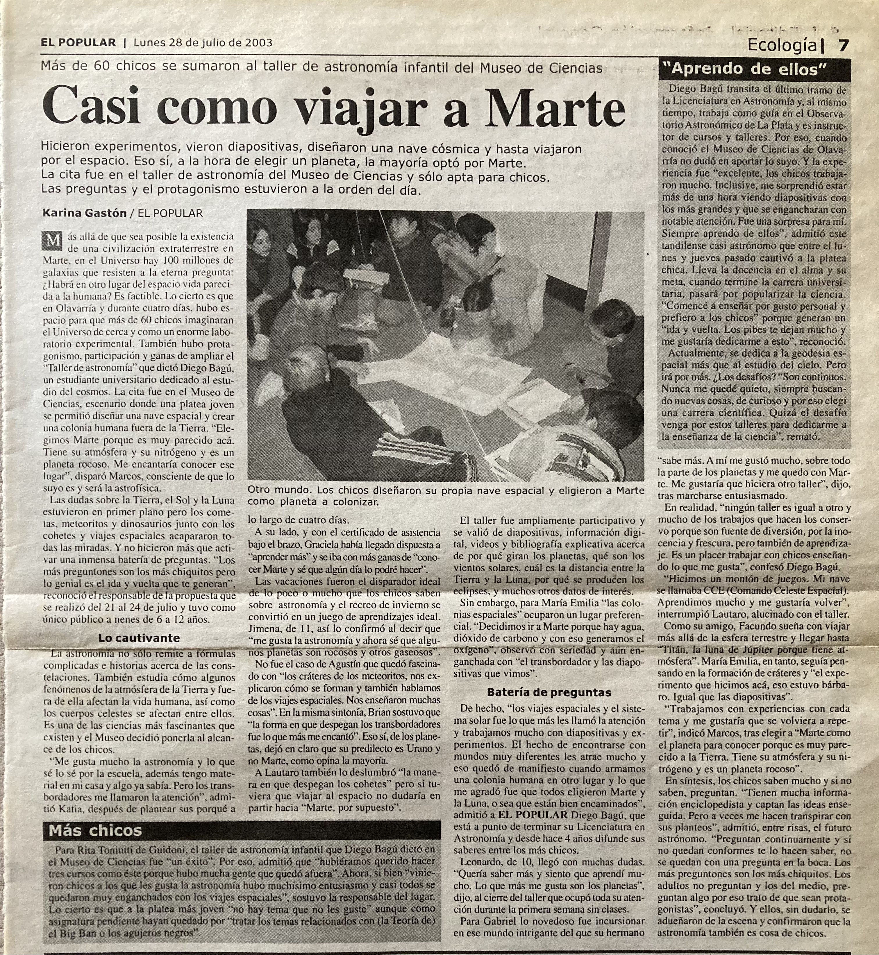Crónica del diario Popular sobre el taller de astronomía para niños desarrollado en el Museo de Ciencias de la ciudad de Olavarría.