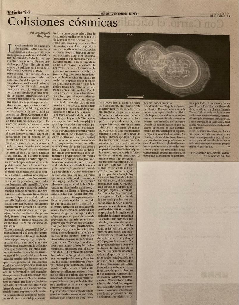 Nota publicada en el diario El Eco de Tandil, el 17 de octubre de 2017.