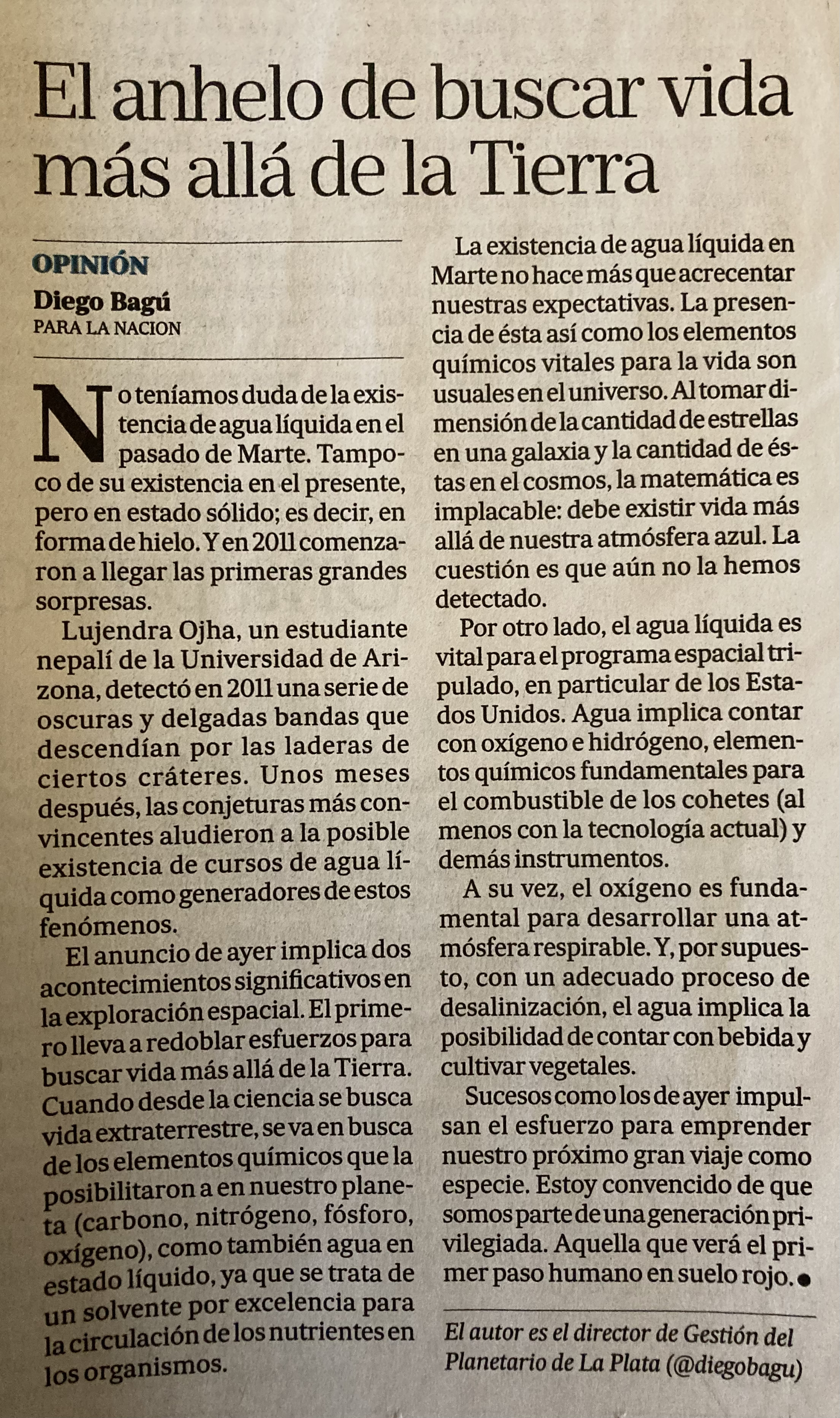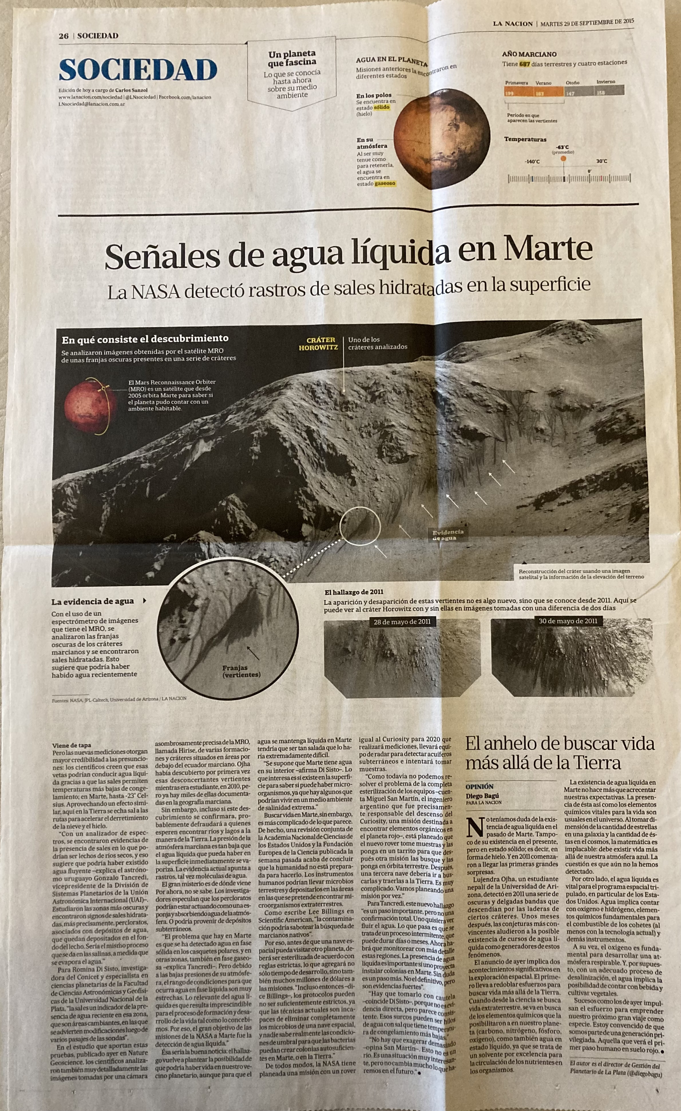 Reflexiones sobre el impacto del hallazgo de sales hidratadas en la superficie de Marte por parte de la NASA. Columna de opinión para diario Clarín.