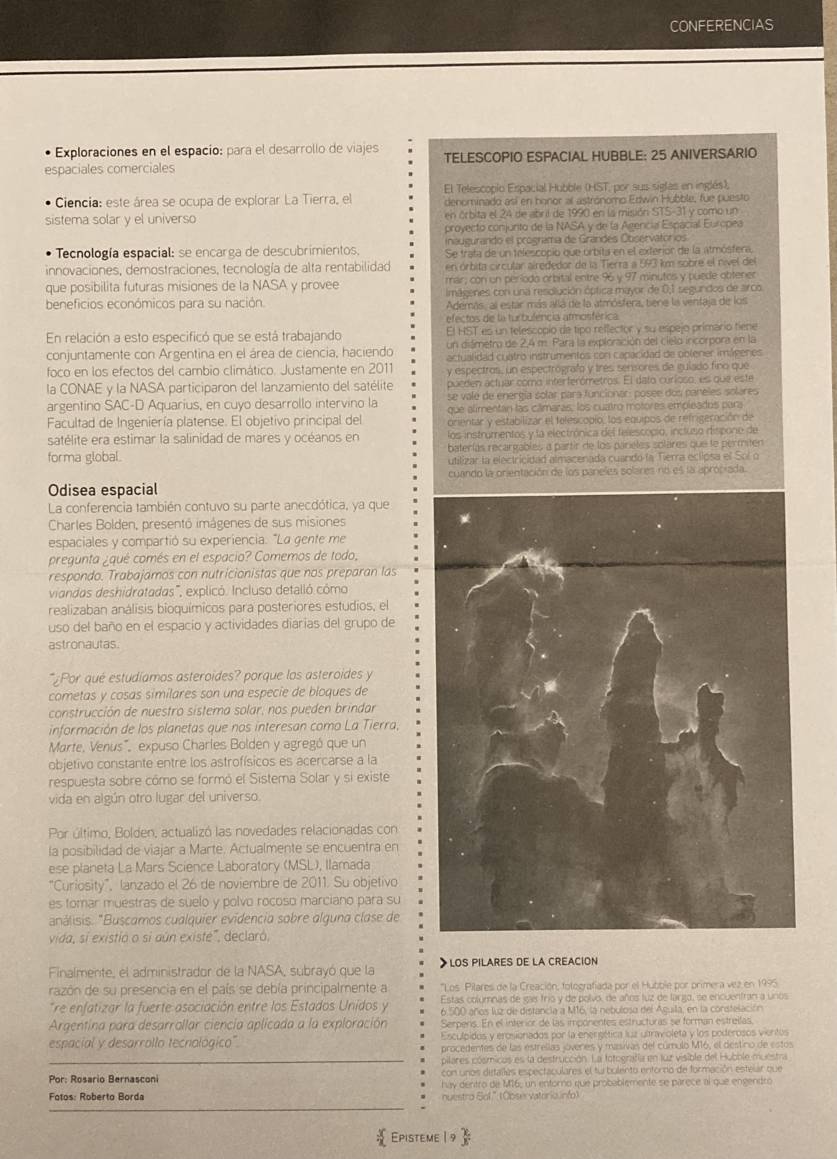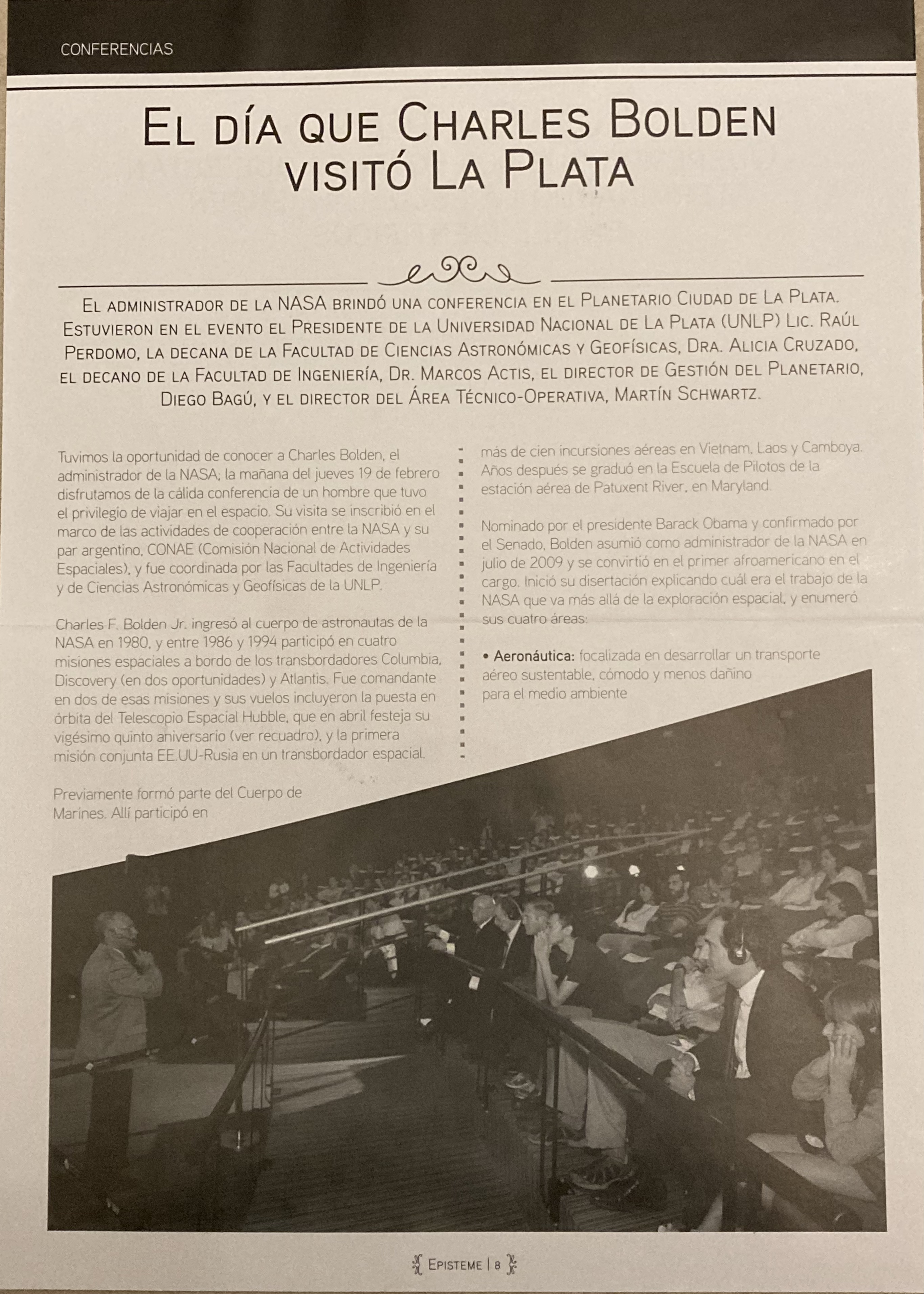 Crónica de la revista de ciencias EPISTEME de mayo de 2015 acerca de la visita al Planetario de la UNLP del ex-astronauta y Administrador de la NASA, Charles Bolden.
