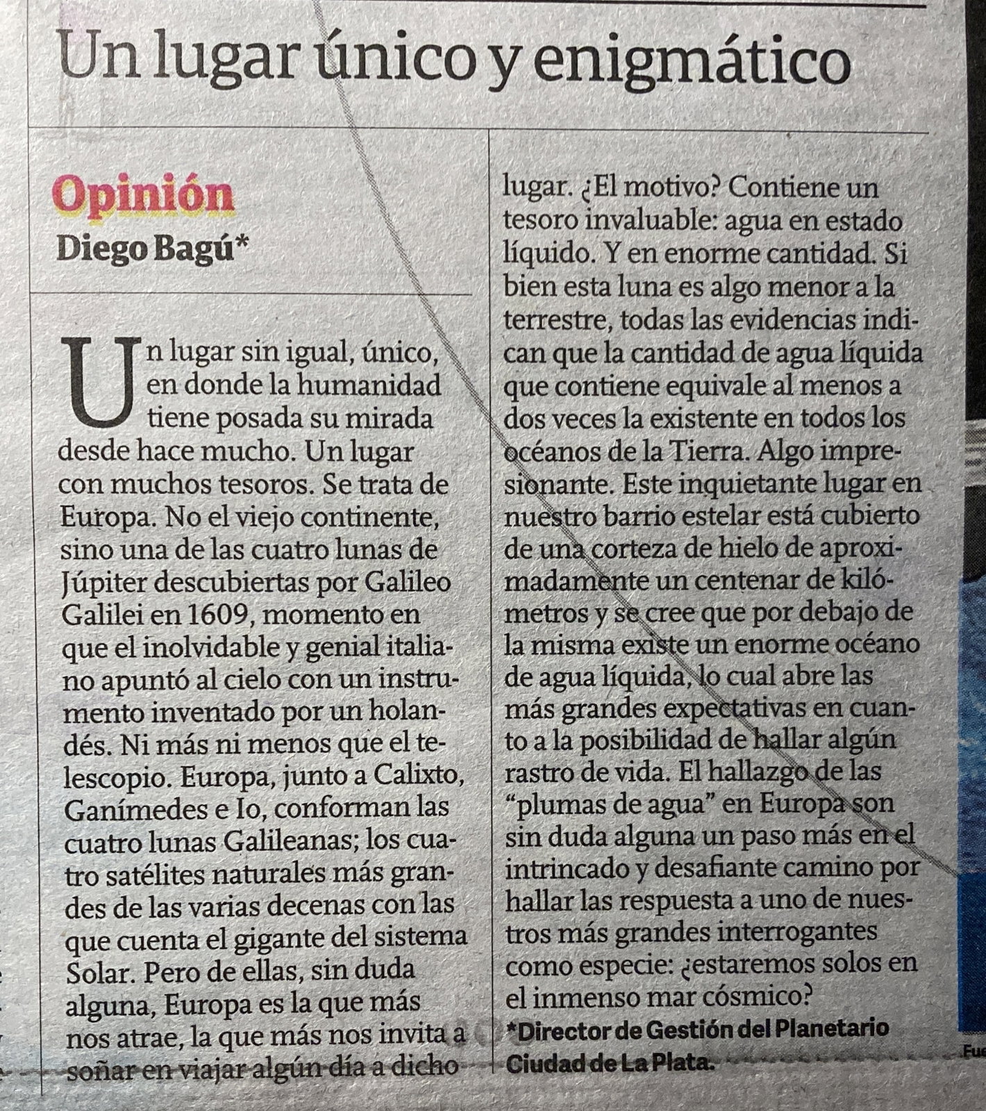 Un lugar sinigual. Único. Un lugar en donde la humanidad tiene posada su mirada desde hace mucho tiempo. Un lugar con muchos tesoros. Se trata de Europa. No el continente, sino una de las cuatro lunas descubiertas por el inolvidable Galileo allá por 1609, momento en que apuntó al cielo un instrumento inventado por un holandés. Ni más ni menos que el telescopio.
