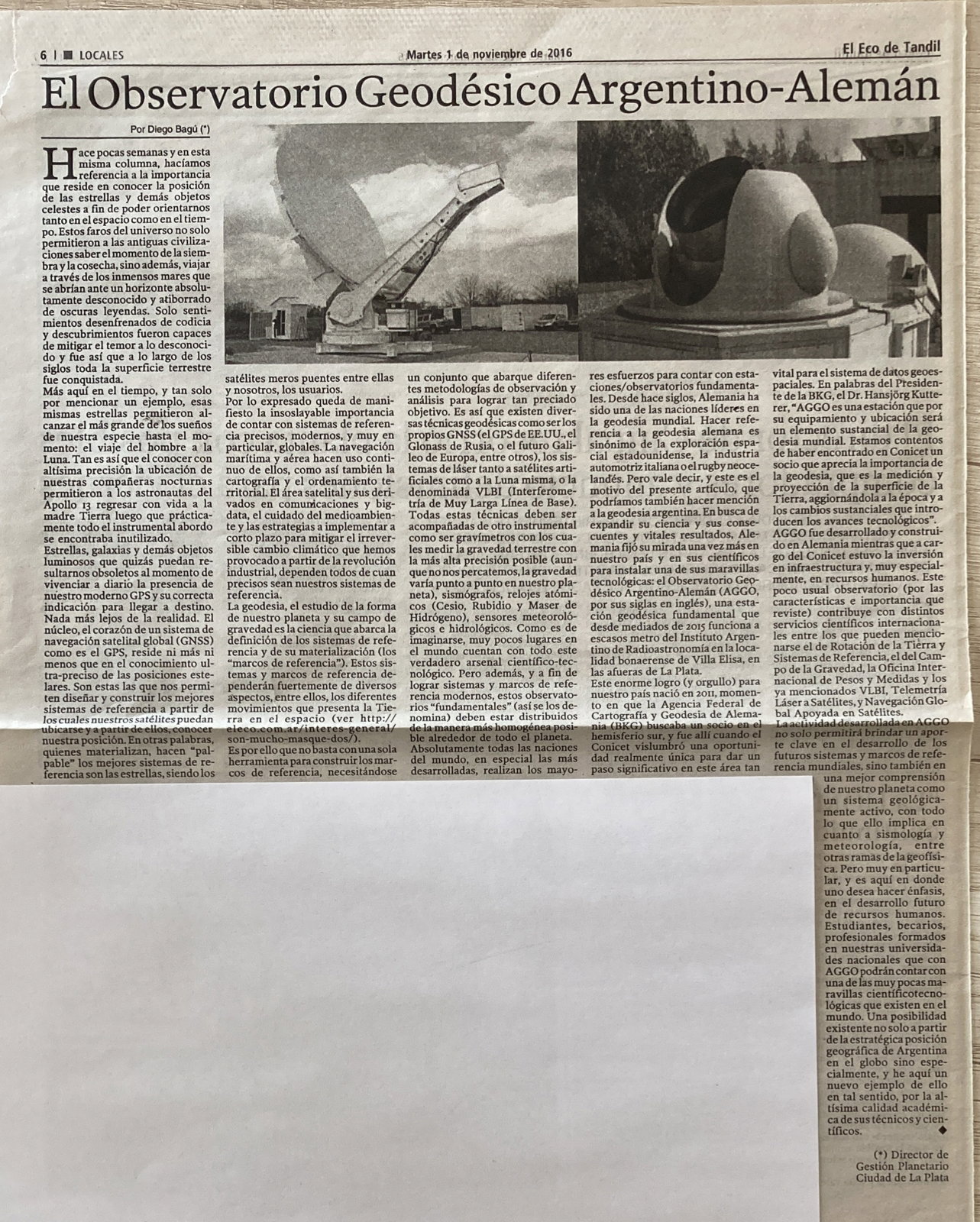 Nota publicada en el diario El Eco de Tandil, el 1 de noviembre de 2016. Puedes ver la nota en: https://www.eleco.com.ar/interes-general/el-observatorio-geodesico-argentino-aleman