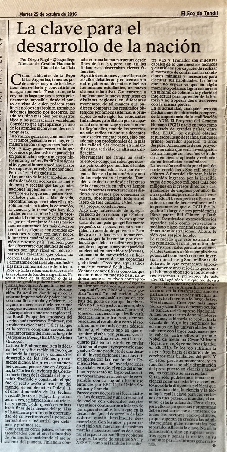 Nota publicada en el diario El Eco de Tandil, el 25 de octubre de 2016. Puedes ver la nota en: https://www.eleco.com.ar/interes-general/la-clave-para-el-desarrollo-de-la-nacion