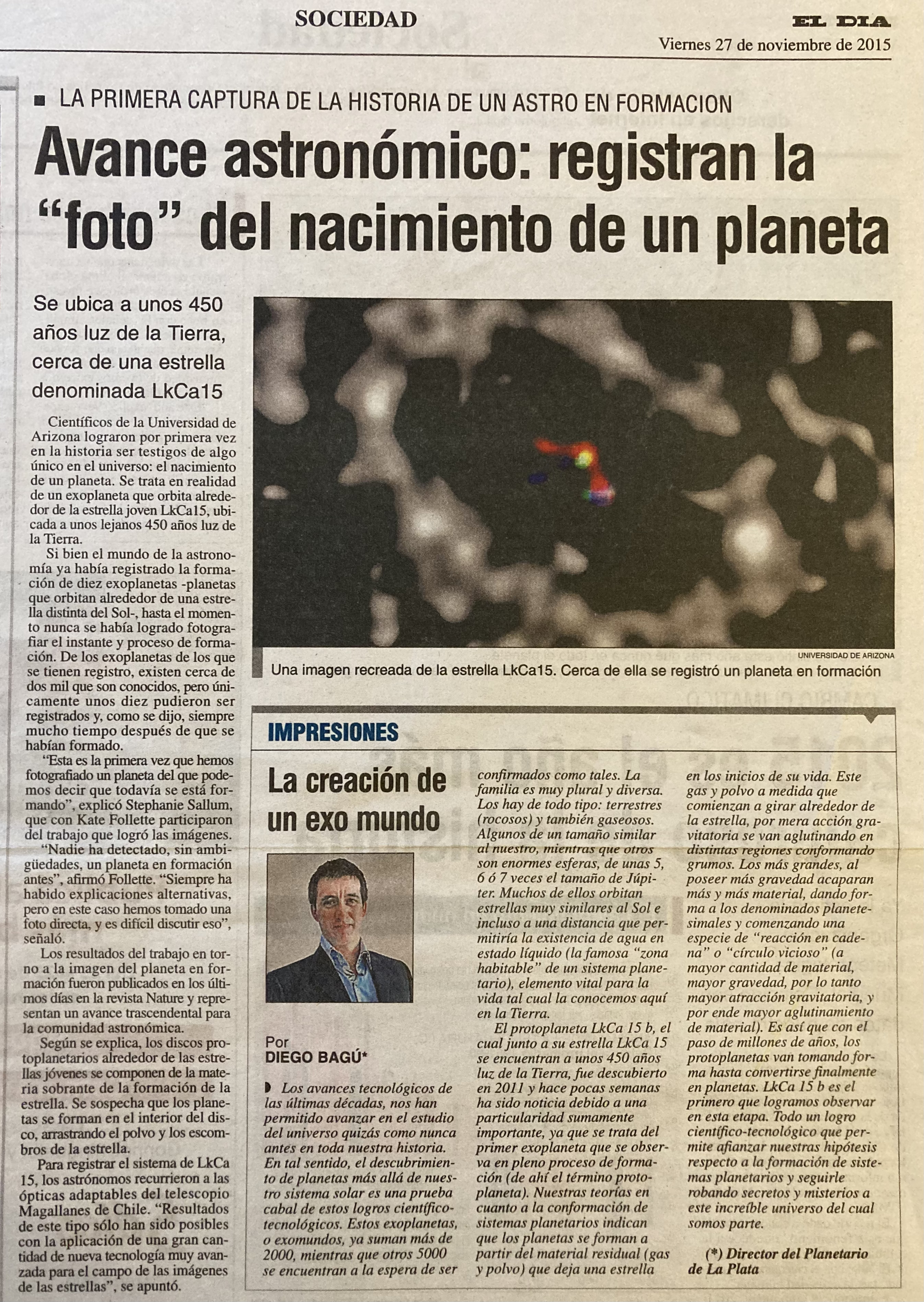Reflexiones sobre el descubrimiento de un exoplaneta en formación. Columna de opinión para diario El día.