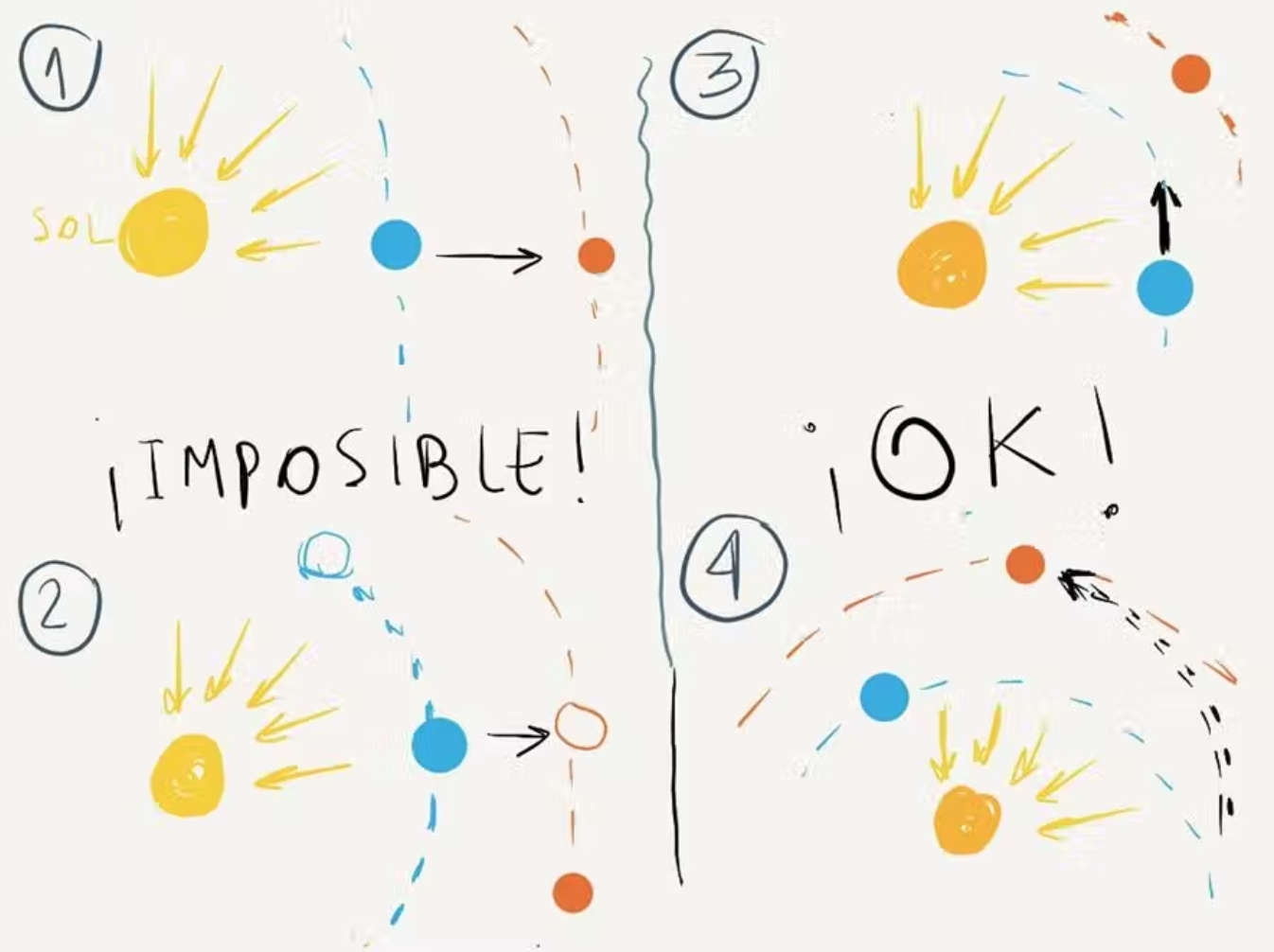 Pero todo, absolutamente todo cambia cuando viajamos en el espacio. Allí, Planolandia deja de tener sentido y comienzan a jugar otros protagonistas estelares, como ser, la gravedad. Sin duda alguna, en pocos años seremos testigos de la más grandiosa aventura que haya emprendido la humanidad en toda su historia: el viaje tripulado a Marte. Pensemos entonces en la ruta que seguirán nuestros privilegiados representantes en unos 15 o 20 años. Es más, dicha ruta es la misma que han realizado y seguirán realizando todas nuestras naves semiautomáticas. Observemos entonces la figura que sigue a continuación; allí existen dos sectores (izquierdo y derecho). En la parte izquierda se configura un viaje imposible de realizar. El realizable es el de la derecha.