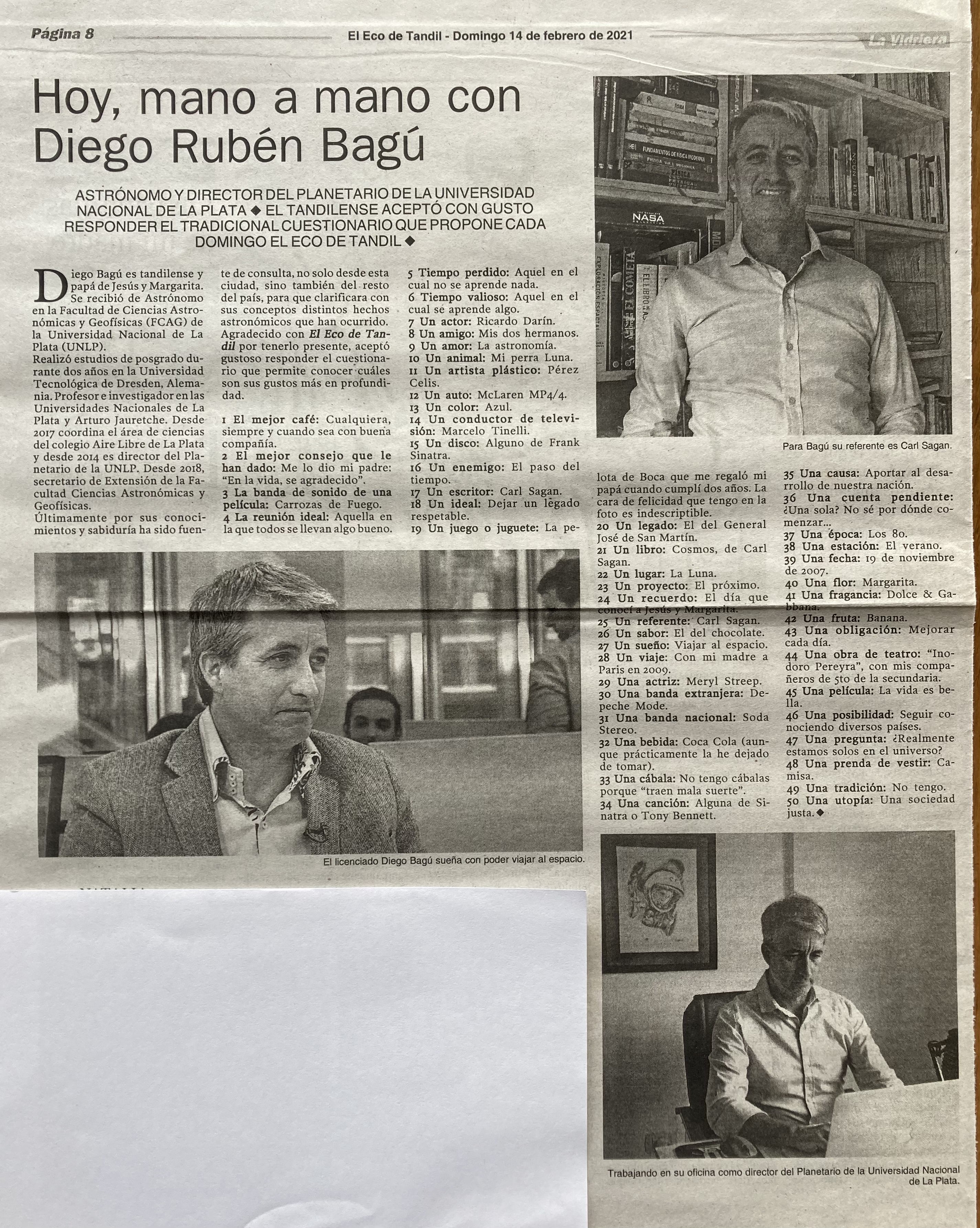 Entrevista personal para diario El Eco de Tandil, el domingo 14 de febrero de 2021.