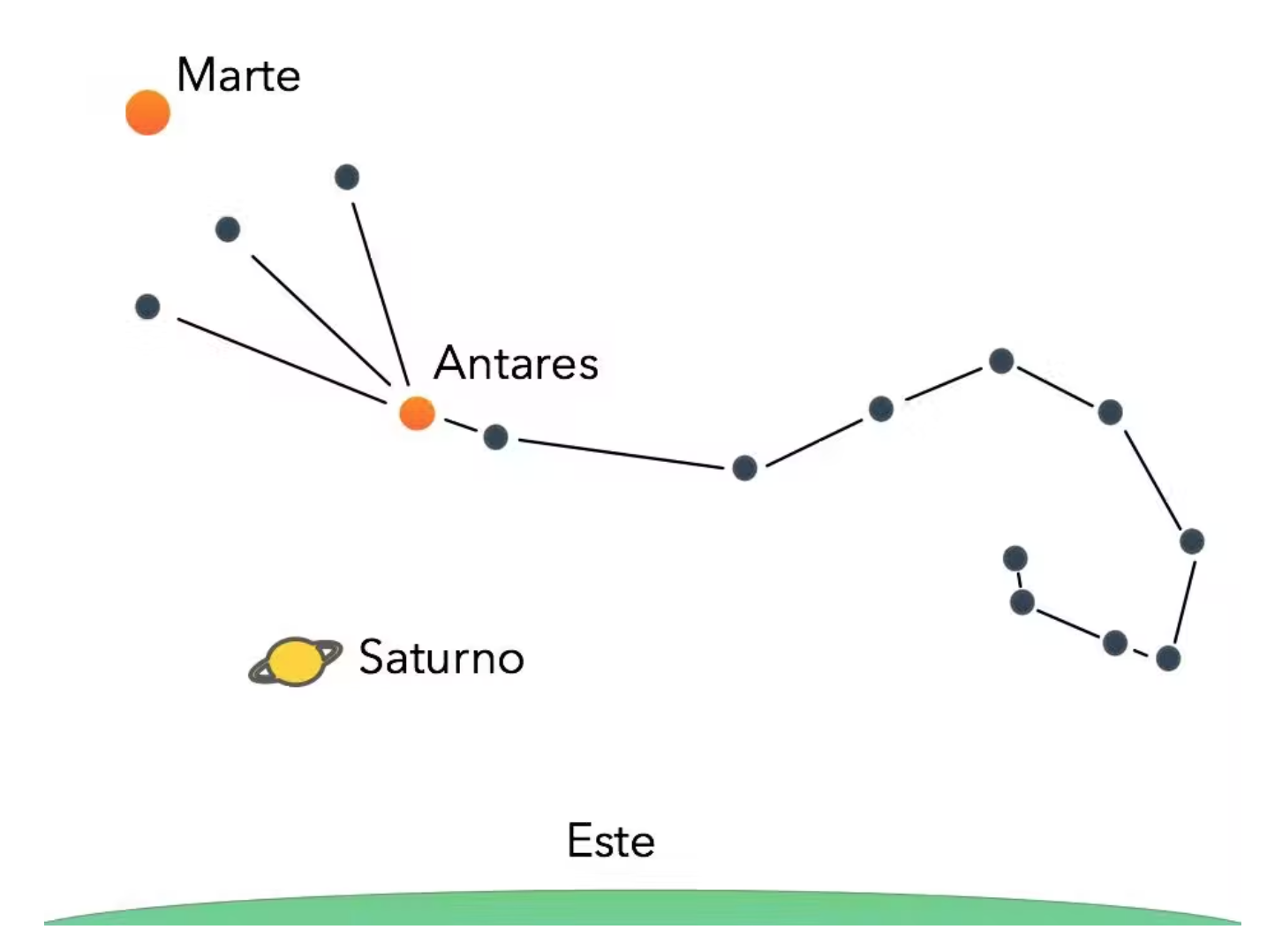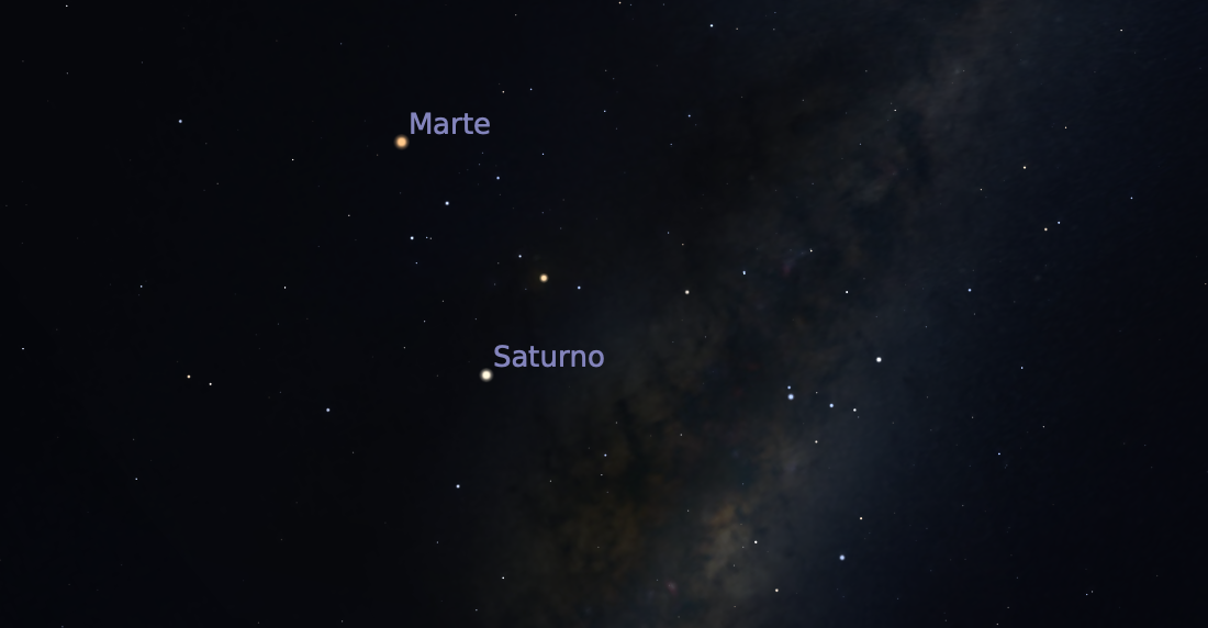 Pero hay más noticias para este boletín cósmico. Resulta que al elevar nuestra mirada al firmamento, encontraremos a Marte muy bien acompañado, ya que estará ni más ni menos junto a Saturno, considerado por muchos el más bello de los planetas conocidos. Y esto no es todo; ambos planetas estarán ubicados en la constelación de Escorpio, una de las más hermosas de las 88 oficialmente reconocidas por la Unión Astronómica Internacional. Hacia fines de mayo y principios de junio, dirigiendo nuestra mirada hacia el este, alrededor de las 22 horas ya tendremos al hermoso escorpión acompañado por Marte (sobre su cabeza) y por Saturno, hacia su costado inferior. La cabeza del escorpión es fácilmente reconocible por tres estrellas alineadas entre sí, a partir de las cuales se desarrolla su cuerpo y finalmente, su cola.