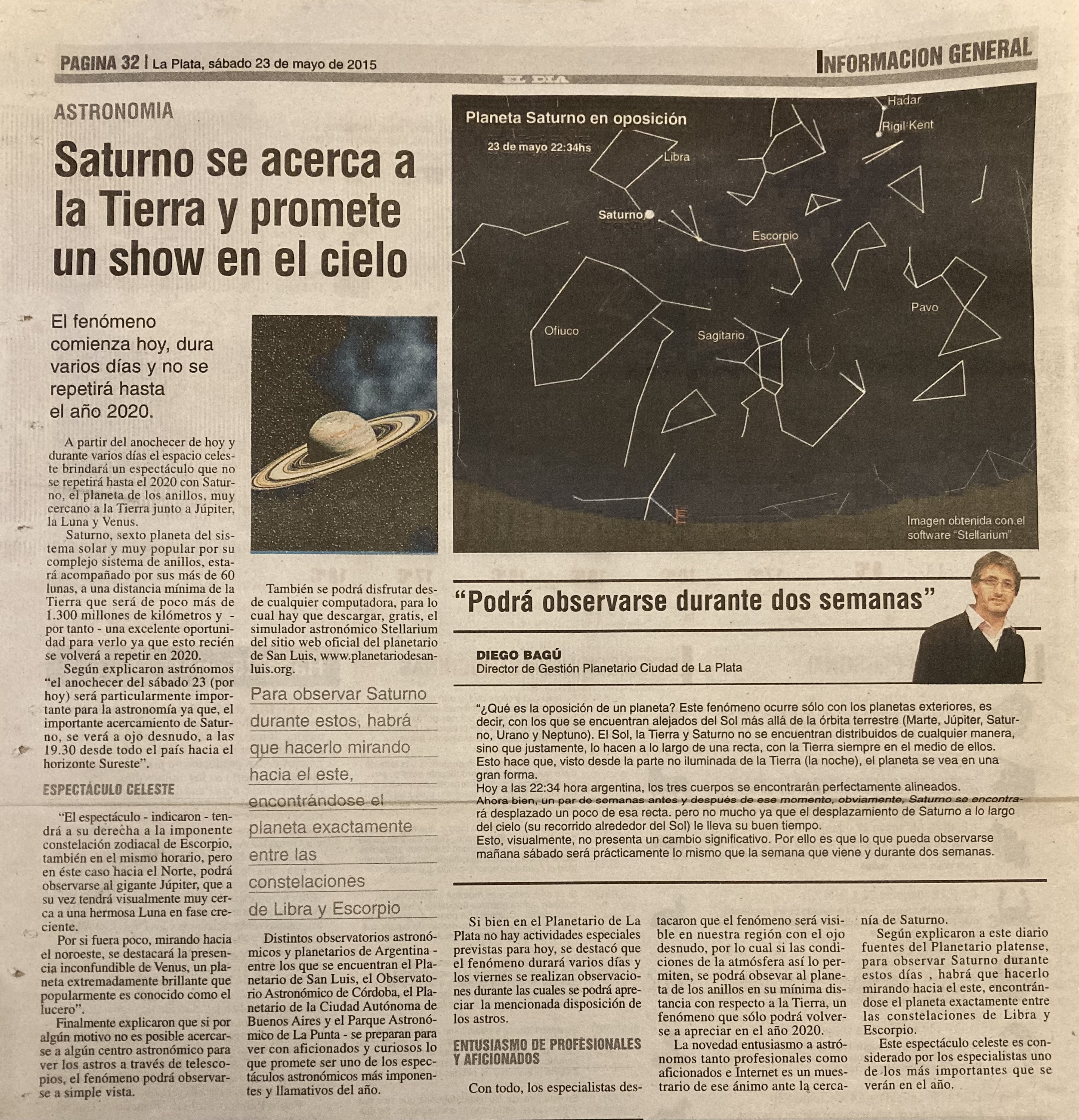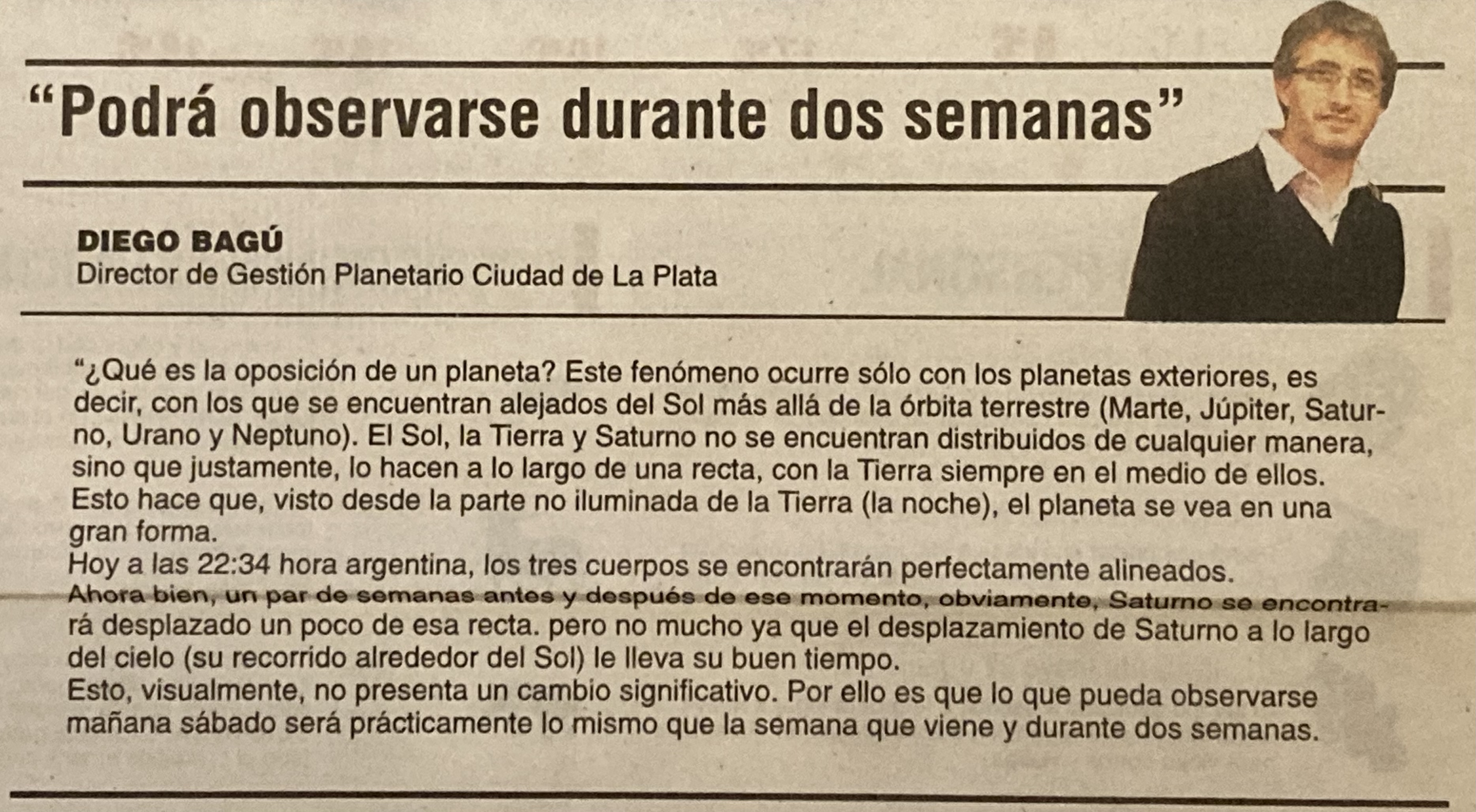 La observación de Saturno en oposición. Columna de opinión para diario El Día.