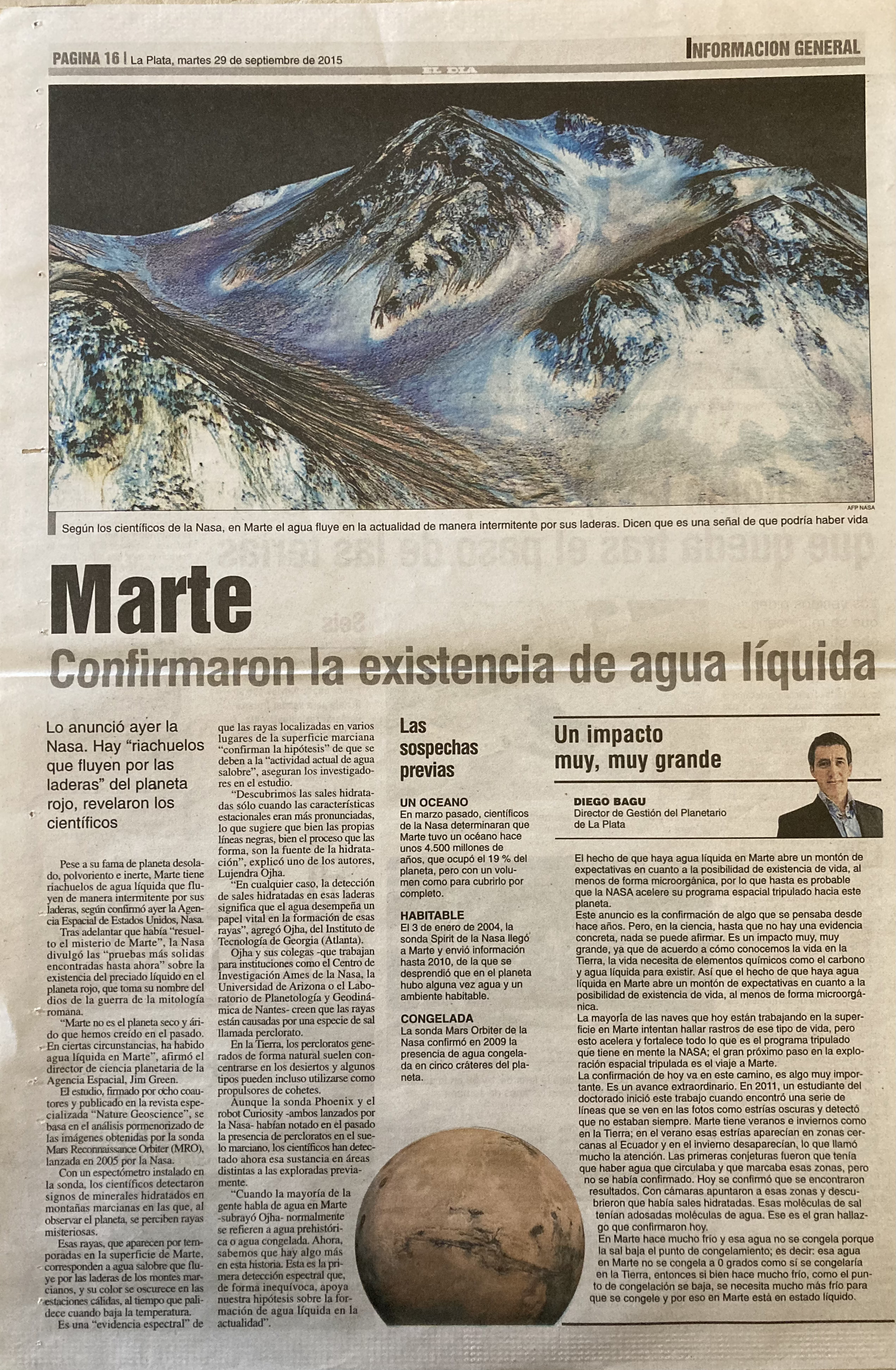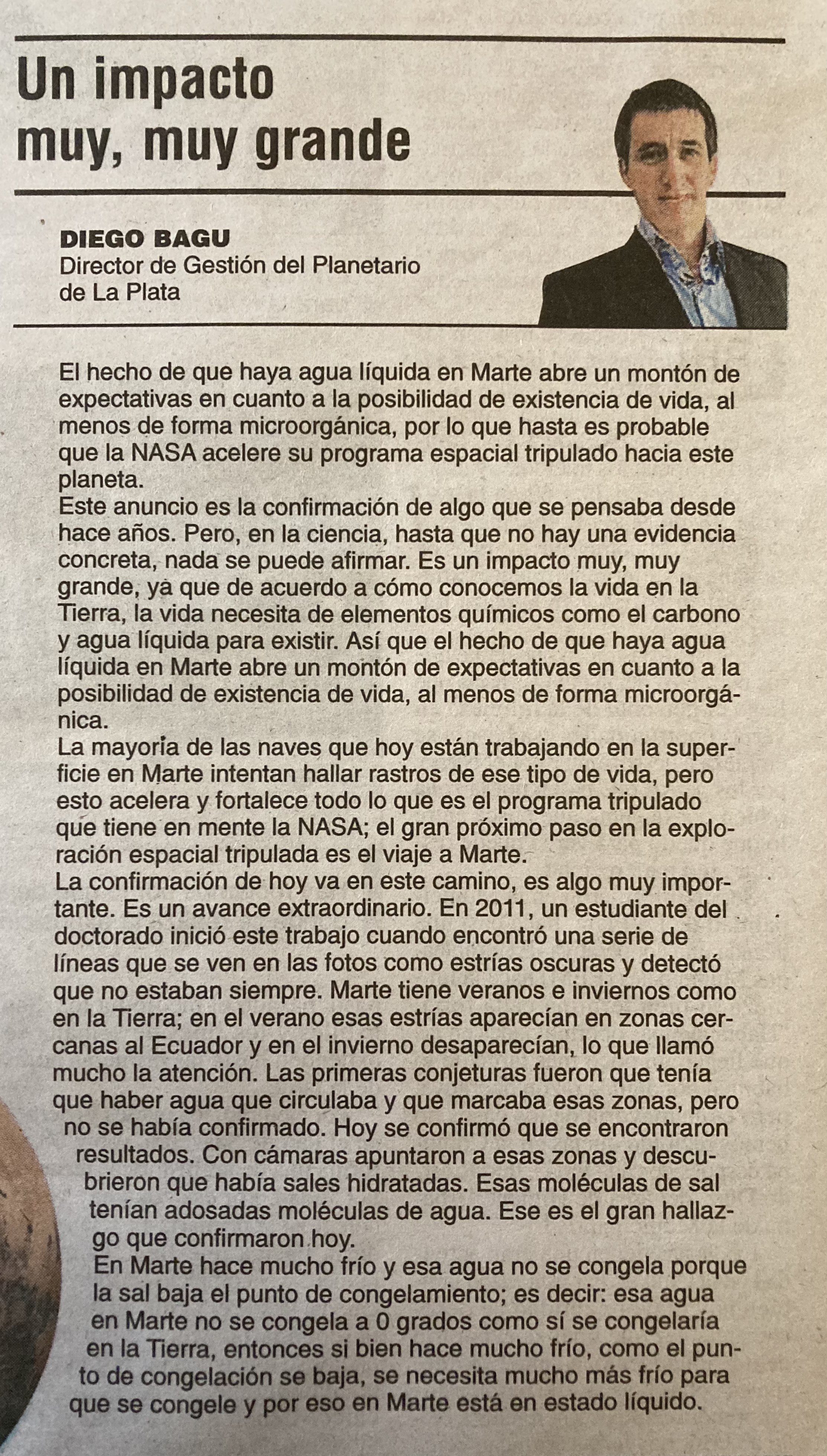 Reflexiones sobre el hallazgo de sales hidratadas en Marte por parte de la misión MRO (NASA). Columna de opinión para diario El Día.
