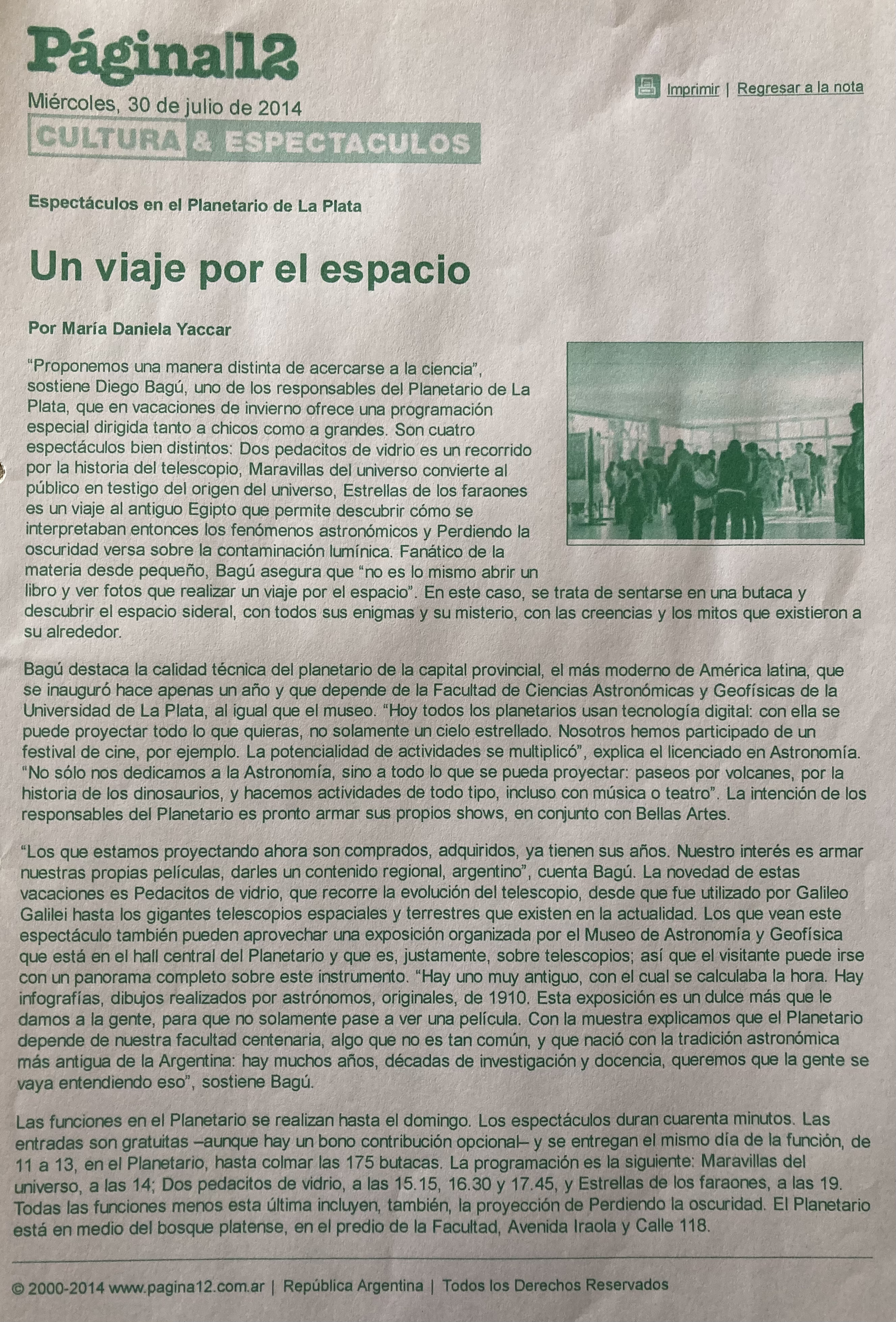 Entrevista para diario Página 12 sobre las actividades del Planetario de la UNLP